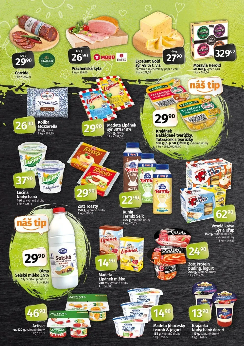 V letáku obchodu COOP najdete širokou nabídku kvalitních mléčných výrobků a sýrů.