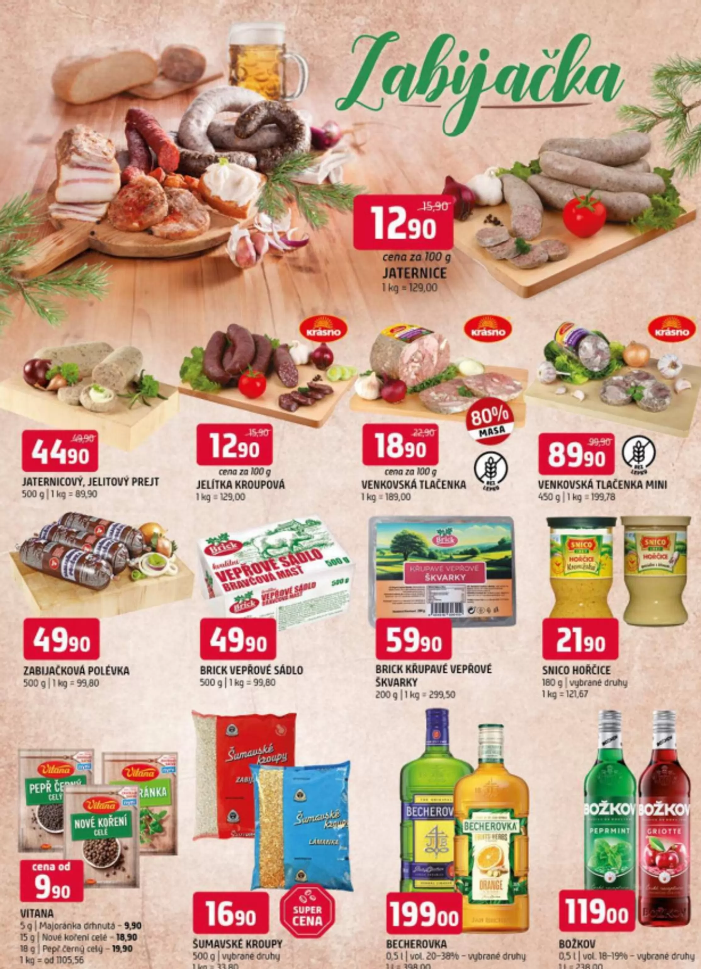 Pro milovníky masových specialit máme také jelítka kroupová za 49,90 Kč a venkovskou tlačenku za 59,90 Kč.