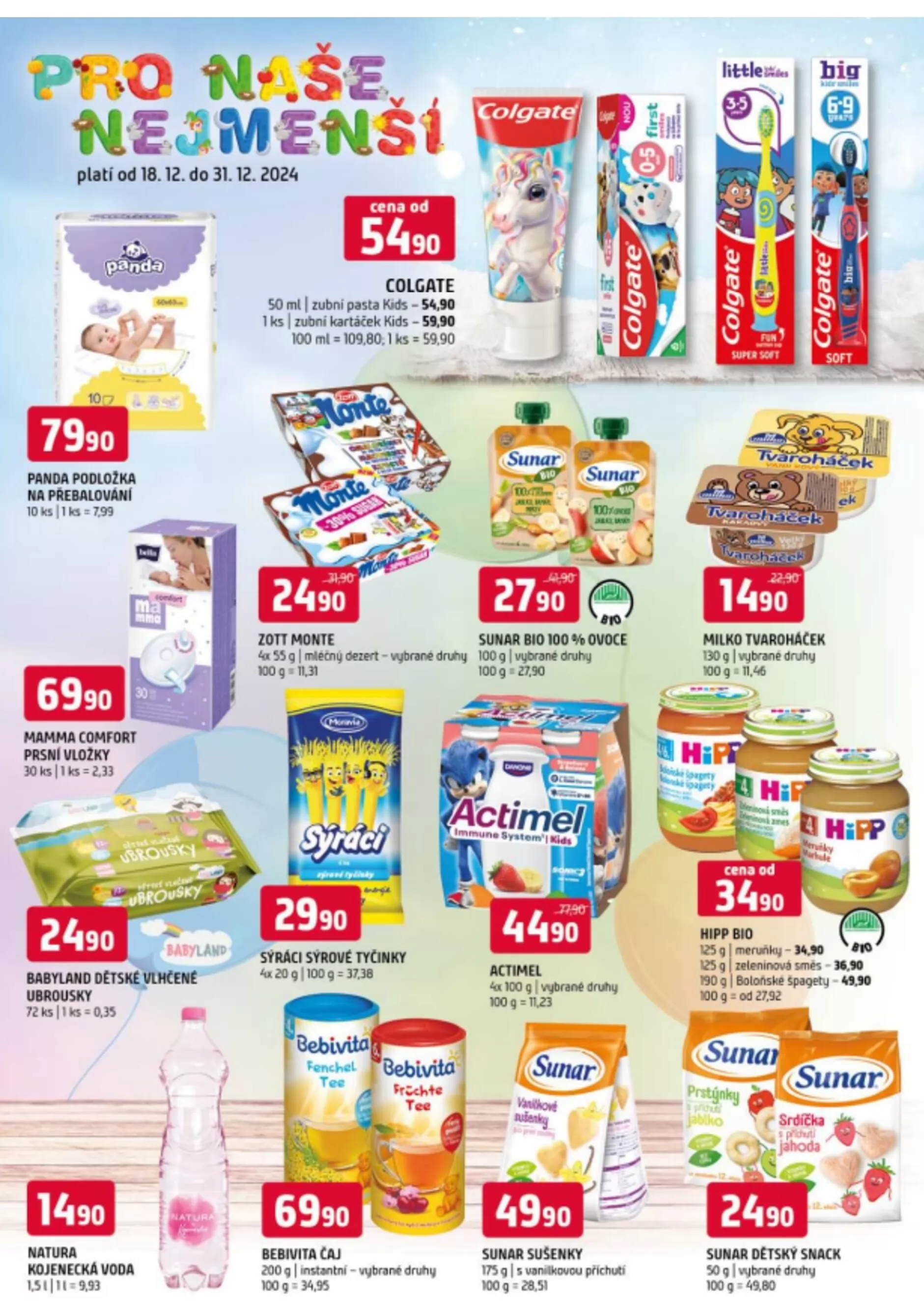 Dále nabízíme kojeneckou vodu a zubní pastu Colgate pro děti za 54,90 Kč.