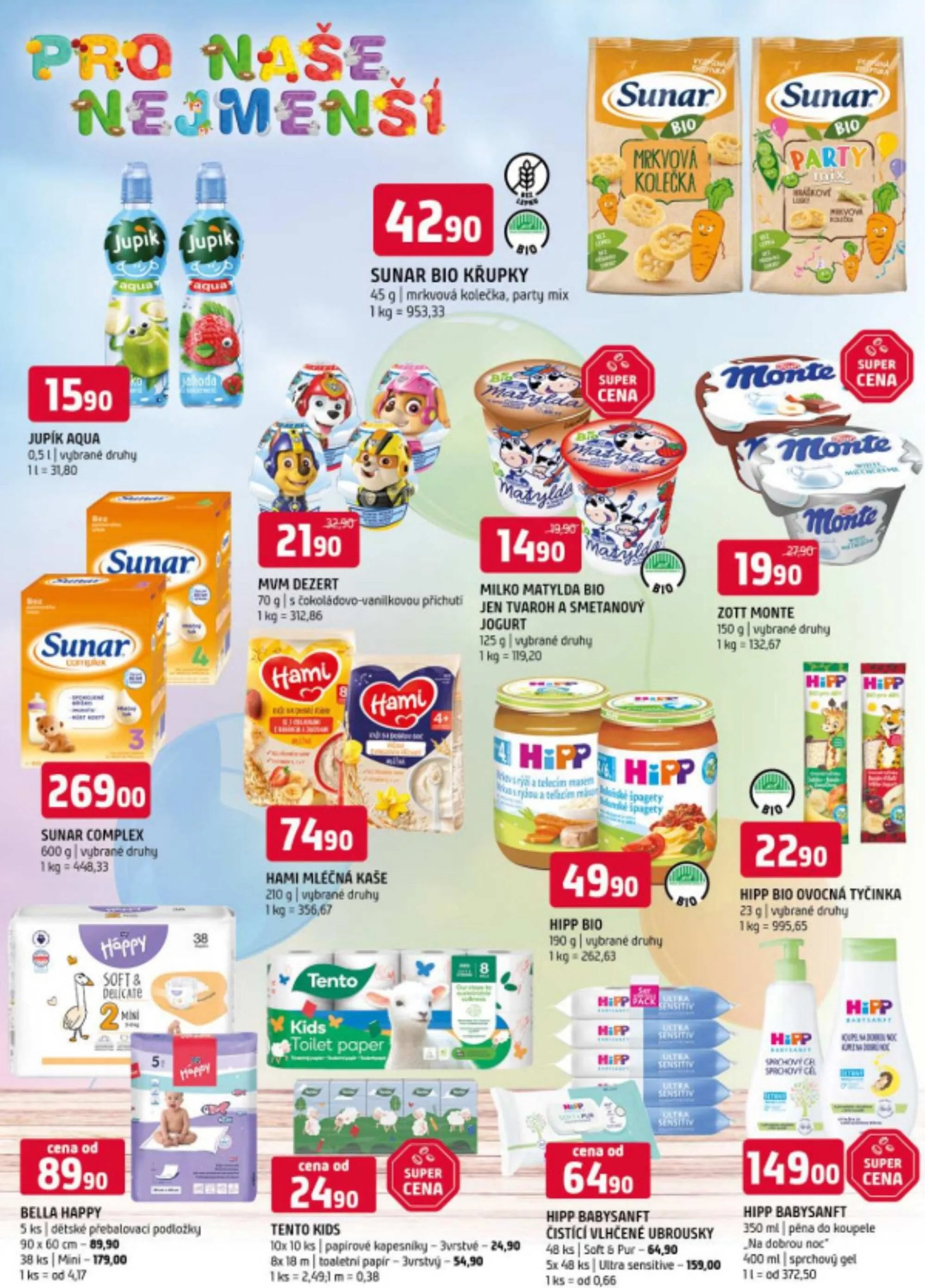 Nezapomeňte také na bio produkty, jako je Milko Matylda s tvarohem a smetanovým jogurtem za 50 Kč, nebo Hipp bio ovocná tyčinka za 149 Kč. Pro údržbu hygieny jsou k dispozici Hipp Babysanft čisticí vlhčené ubrousky za 64 Kč.