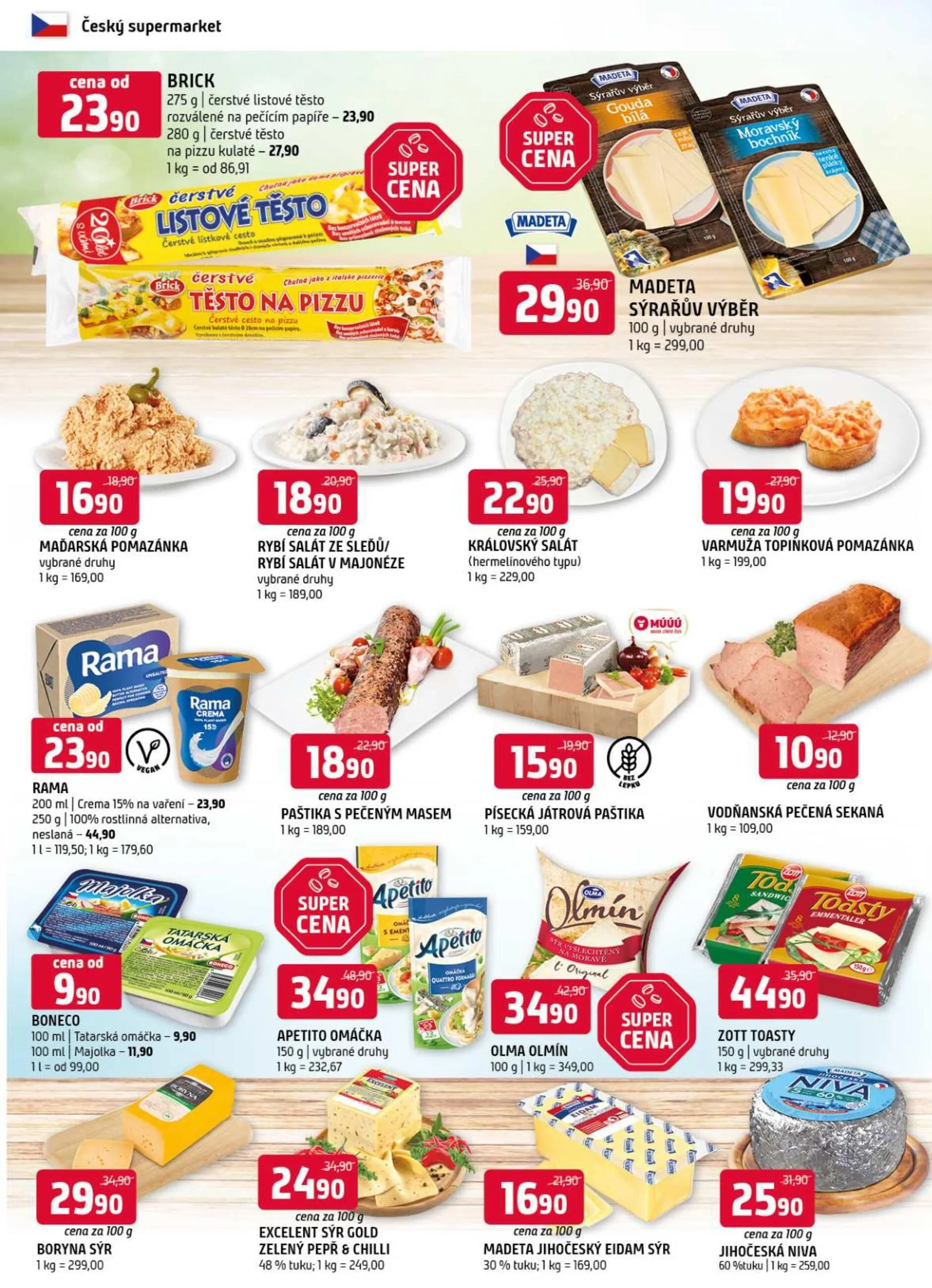 V letáku obchodu COOP najdete širokou nabídku čerstvých produktů za skvělé ceny. Například čerstvé listové těsto o hmotnosti 275 g je k dispozici za 23,90 Kč, zatímco kulaté těsto na pizzu (280 g) stojí 27,90 Kč.