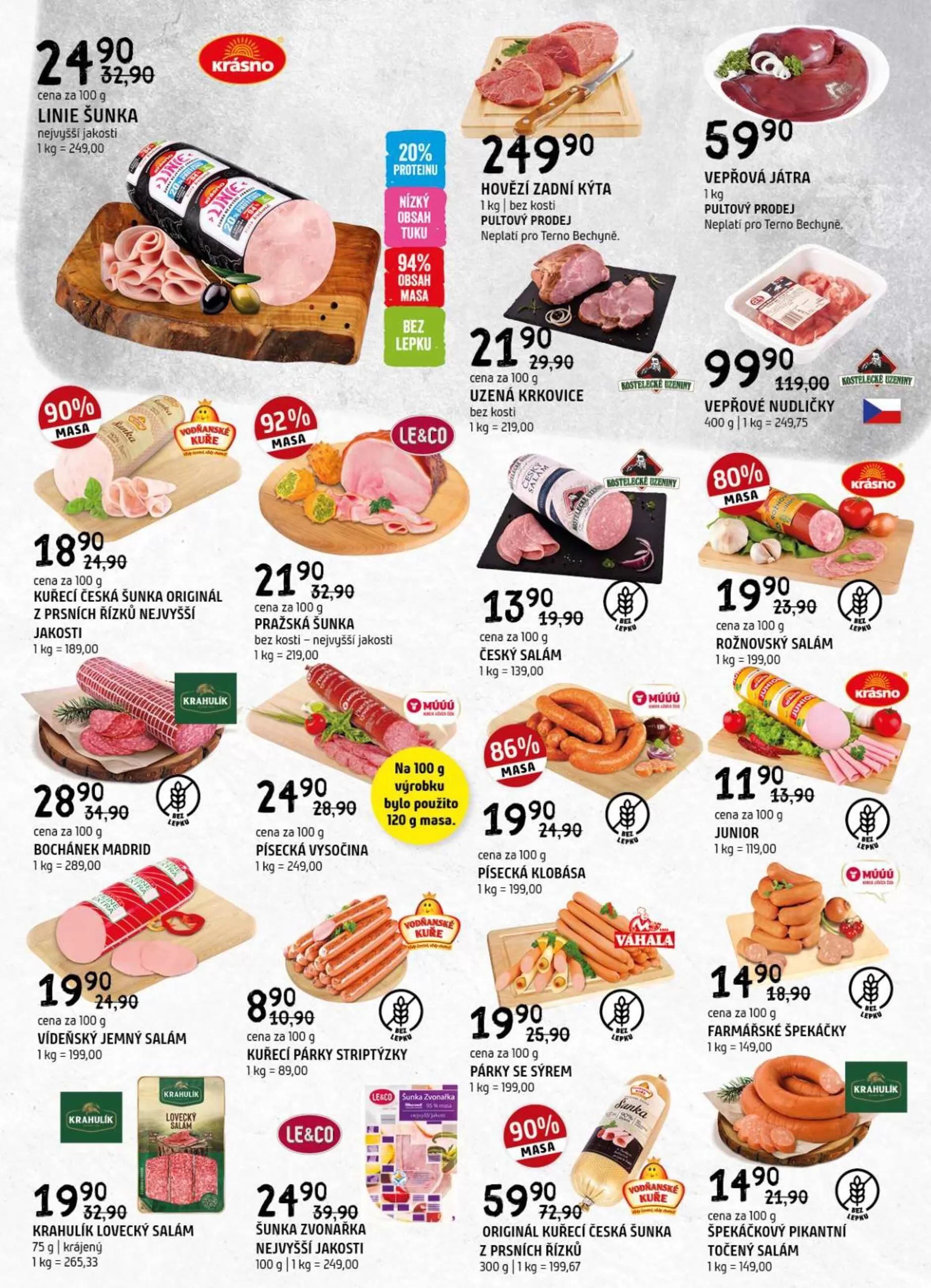 Dále nabízíme vídeňský jemný salám za 249,00 Kč/kg a český salám za 139,00 Kč/kg. Pro milovníky klobás máme píseckou klobásu za 199,00 Kč/kg a rožnovský salám za 199,00 Kč/kg.