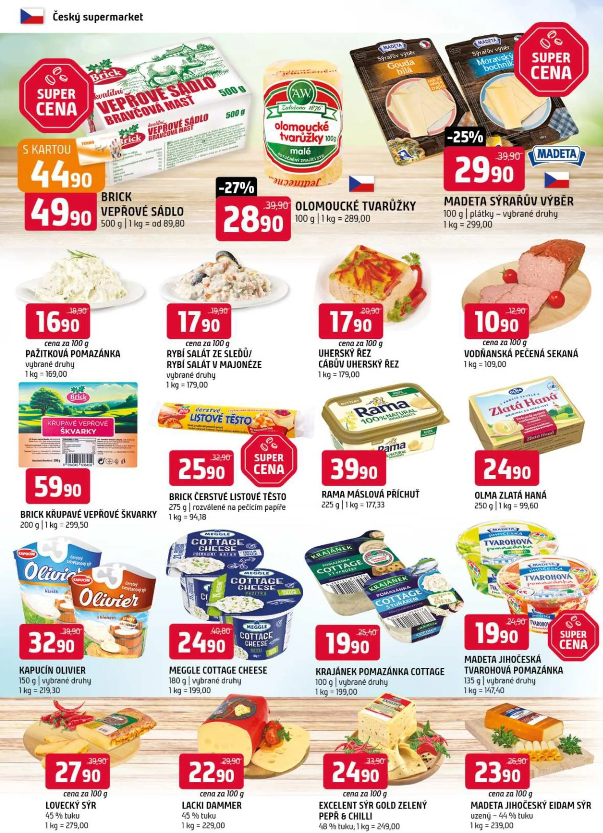 Mezi lákavé položky patří olomoucké tvarůžky za 28,90 Kč za 100 g, nebo vepřové sádlo, které je k dostání za 89,80 Kč/kg.