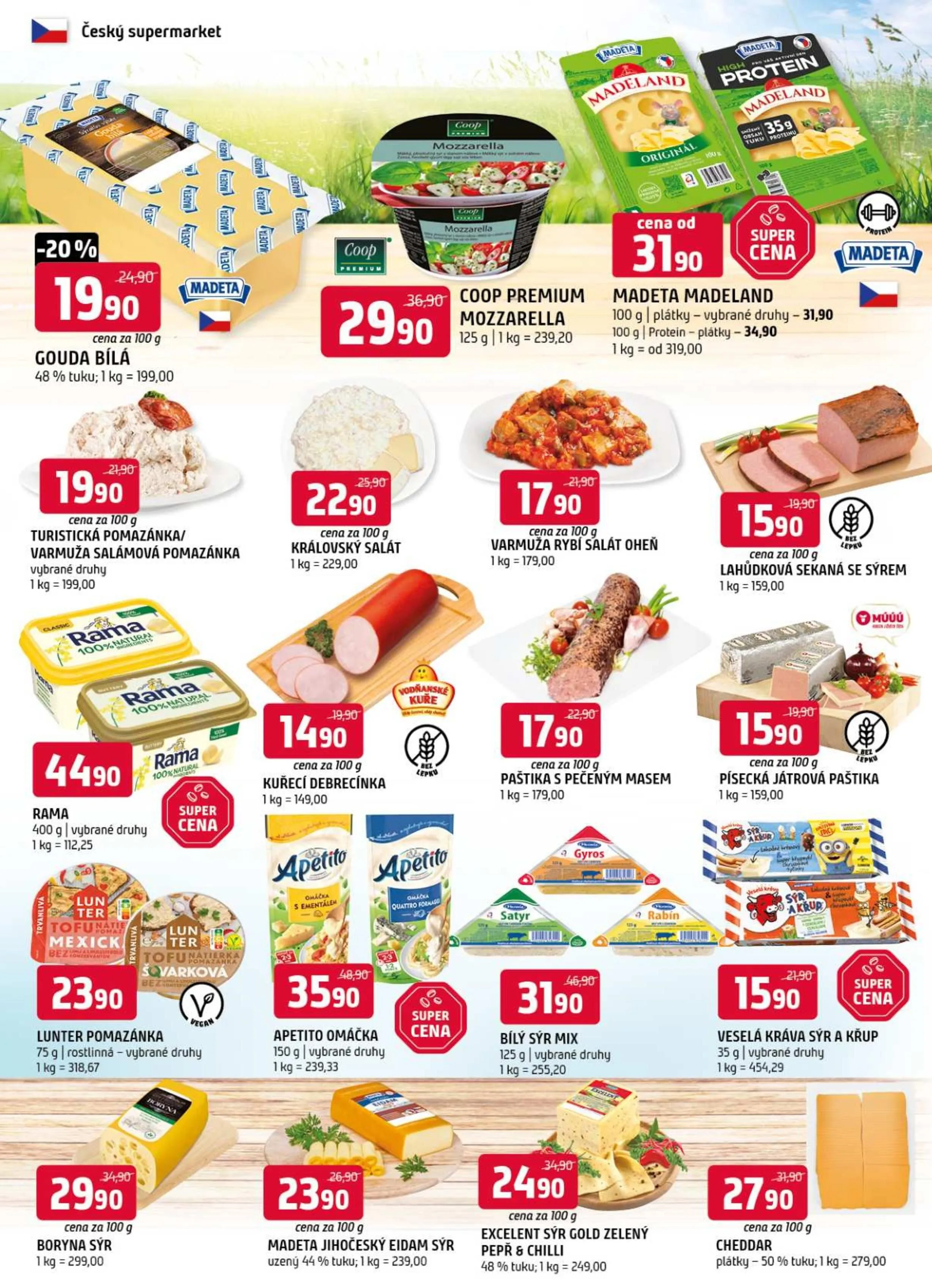Madeta Madeland plátky jsou za 31,90 Kč/100 g, zatímco královský salát můžete pořídit za 229,00 Kč/kg.