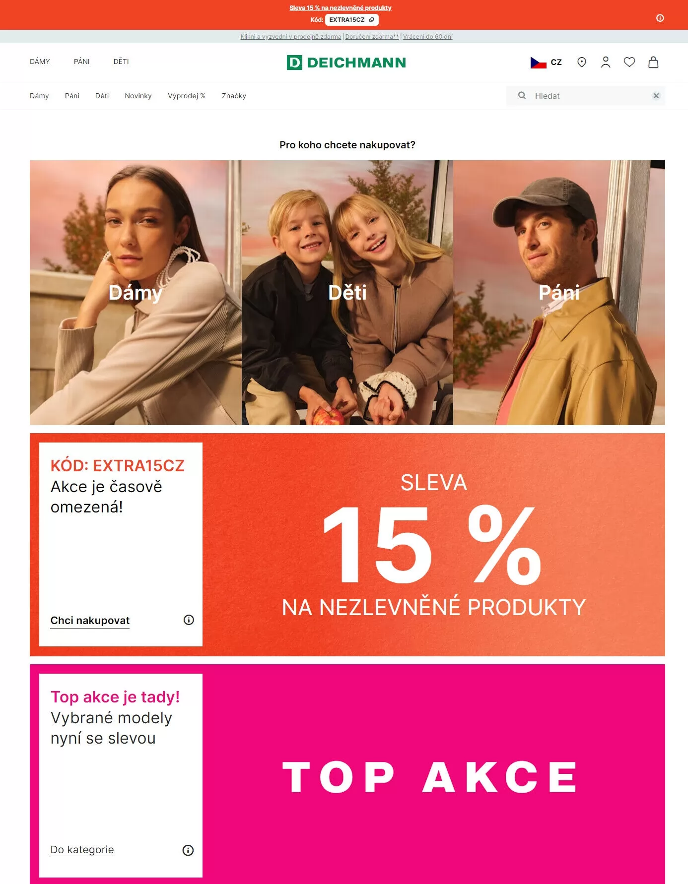 V obchodě DEICHMANN nyní probíhá skvělá akce! Získejte 15 % slevu na nezlevněné produkty s kódem extra15cz. Nezapomeňte, že akce je časově omezená! V nabídce najdete široký výběr obuvi pro dámy, pány i děti. Navíc máte možnost vrácení zboží do 60 dnů a dopravu zdarma. Prozkoumejte novinky a výprodeje a vyberte si z oblíbených značek. Neváhejte a nakupujte nyní!