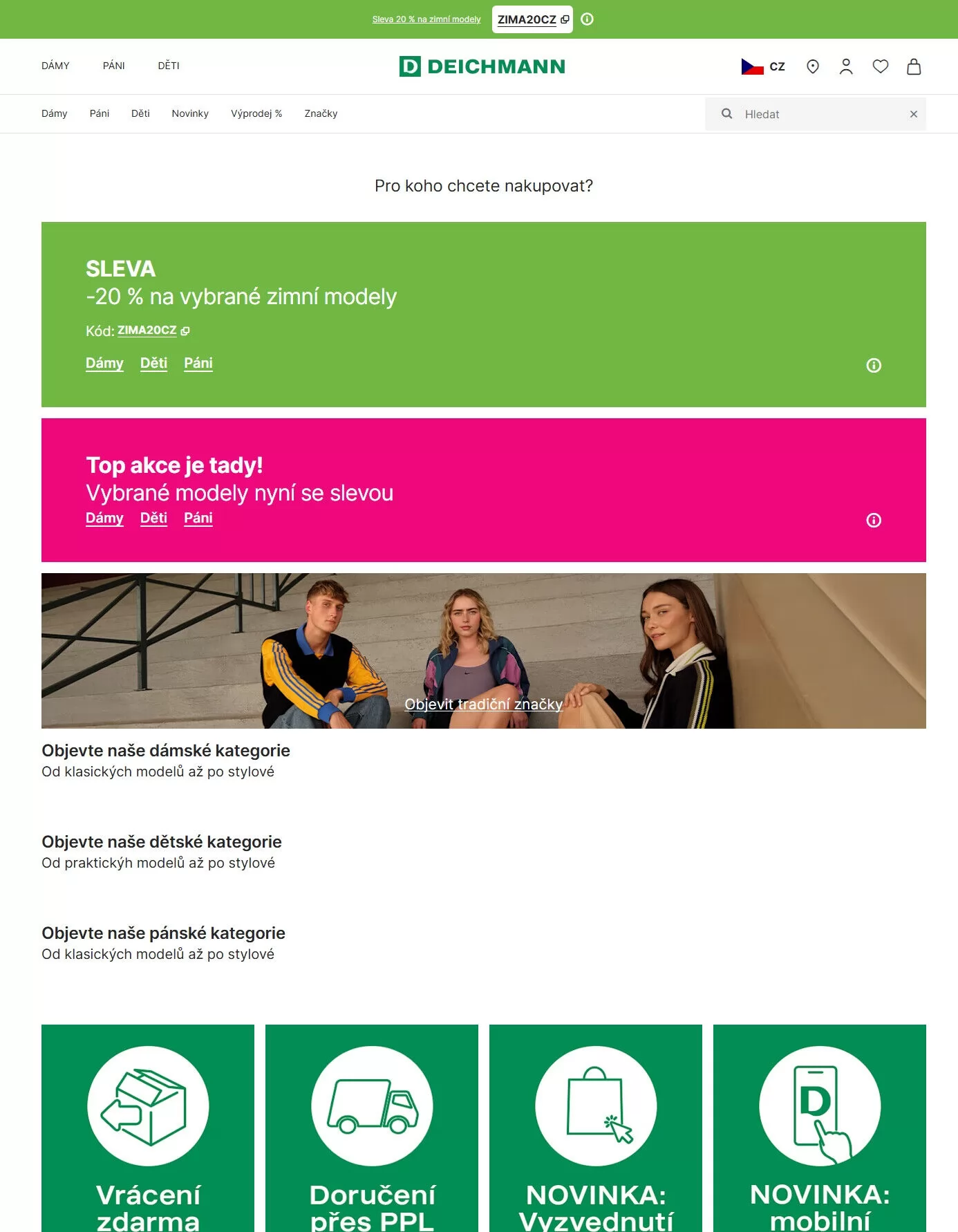 Nezapomeňte využít skvělou akci - sleva 20 % na vybrané zimní modely s kódem zima20cz. V letáku také najdete novinky a výprodejové nabídky. Využijte možnost vrácení a doručení, abyste si nakupování užili bez starostí. Top akce je tady, tak neváhejte a objevte své oblíbené modely!