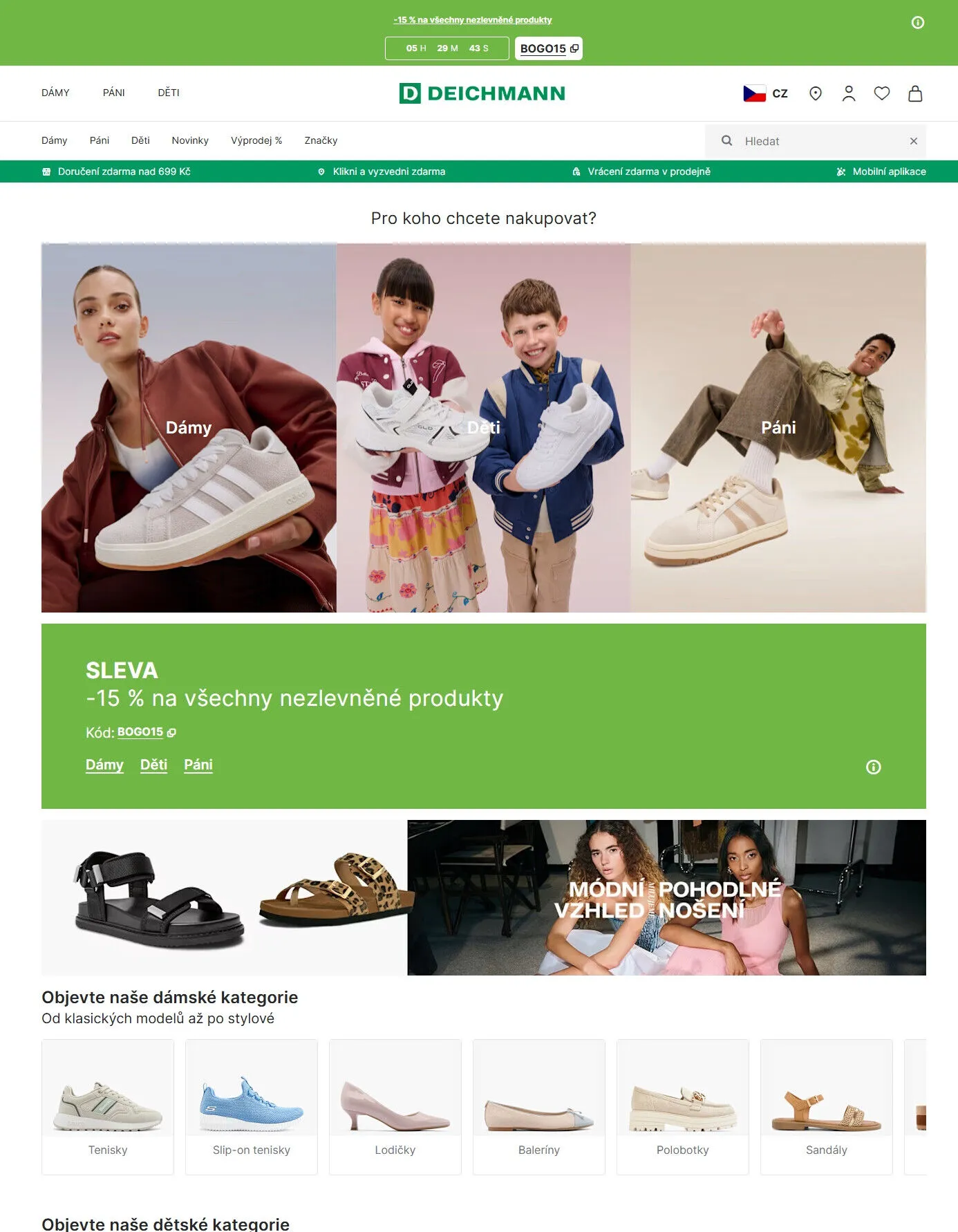 V letáku obchodu DEICHMANN najdete širokou nabídku obuvi pro dámy, pány a děti. Objevte naše dámské kategorie, které zahrnují klasické modely i stylové tenisky, slip-on tenisky, lodičky, baleríny, polobotky a sandály. Pro děti máme také pestrou nabídku obuvi, která je pohodlná a trendy. Nezapomeňte využít slevu 15 % na všechny nezlevněné produkty s kódem bog015. Doručení zdarma nad 699 Kč a možnost vrácení zdarma v prodejně činí nákup ještě příjemnějším. Navštivte nás a objevte novinky a výprodeje!