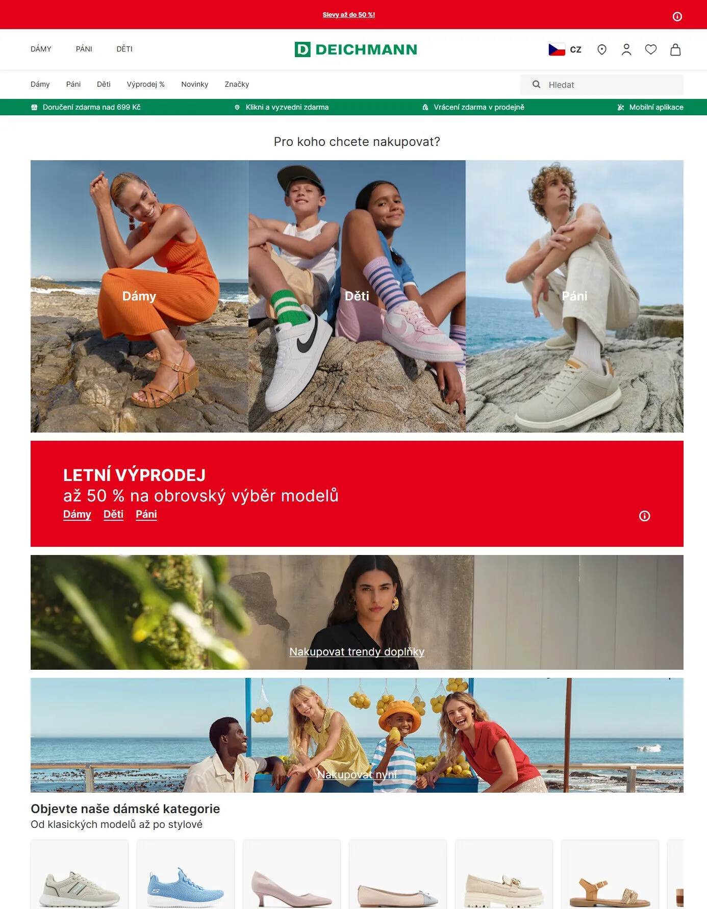 V letáku obchodu DEICHMANN najdete širokou nabídku produktů pro dámy, pány a děti. Objevte novinky a vyberte si z obrovského výběru modelů, které jsou nyní v letním výprodeji s slevami až 50 %. Pro dámy máme k dispozici klasické i stylové modely, které potěší každého. Nezapomeňte využít možnost "klikni a vyzvedni zdarma" a také doručení zdarma při nákupu nad 699 Kč. Vrácení zboží je zdarma v prodejně. Stáhněte si naši mobilní aplikaci a nakupujte pohodlně!