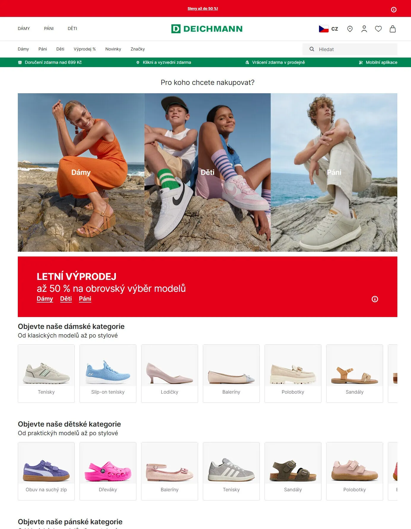 V letáku obchodu DEICHMANN najdete širokou nabídku obuvi pro dámy, pány a děti. Objevte novinky a vyberte si z klasických modelů, stylových tenisek, elegantních lodiček, pohodlných balerín nebo praktických dřeváků. Nezapomeňte na letní výprodej, kde můžete ušetřit až 50 % na vybraných modelech. Využijte možnost klikni a vyzvedni zdarma, nebo si objednejte s doručením zdarma nad 699 Kč. A pokud se rozhodnete pro vrácení, můžete to udělat zdarma v prodejně. Pro snadnější nakupování si stáhněte naši mobilní aplikaci a objevte všechny kategorie obuvi na jednom místě!