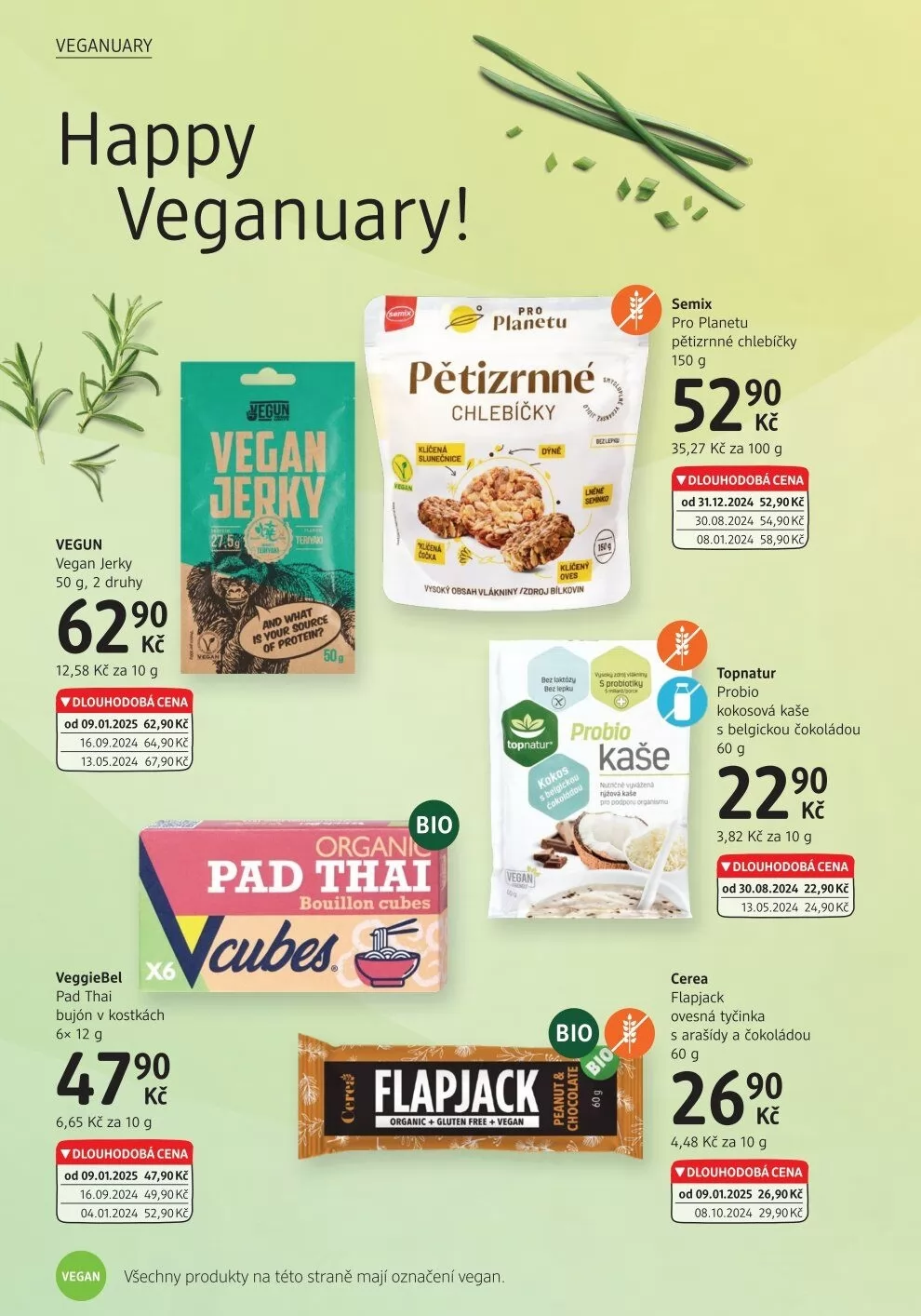 V letáku obchodu dm drogerie najdete širokou nabídku veganských produktů, které potěší každého milovníka rostlinné stravy. Mezi novinkami se objevují vegan jerky v dvou druzích, balení 50 g za 629 Kč, s dlouhodobou cenou od 09.01.2025. Dále si můžete vychutnat veggiebel pad thai bujón v kostkách, 6x12 g za 479 Kč, také s dlouhodobou cenou.