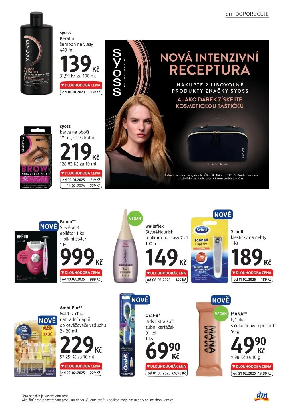 V letáku obchodu dm drogerie najdete širokou nabídku nových produktů, které potěší každého. Mezi nimi je například Syoss keratin šampon na vlasy o objemu 440 ml za 139 Kč, ideální pro dlouhodobou péči o vlasy. Dále nabízíme Syoss barvu na obočí v různých odstínech, která je k dispozici za 219 Kč.