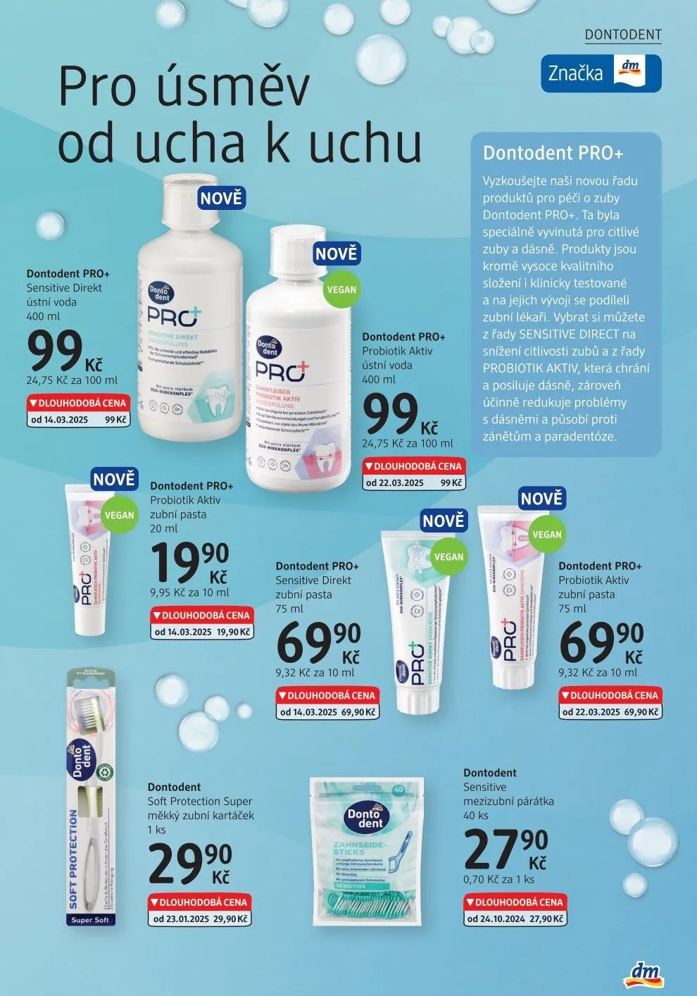V letáku obchodu dm drogerie najdete novou řadu produktů pro péči o zuby dontodent pro+, která je speciálně vyvinutá pro citlivé zuby a dásně. Mezi novinkami je ústní voda dontodent pro+ sensitive direkt (400 ml) za 99 Kč a zubní pasta dontodent pro+ sensitive direkt (75 ml) za 69,90 Kč. Obě produkty jsou vegan a klinicky testované.