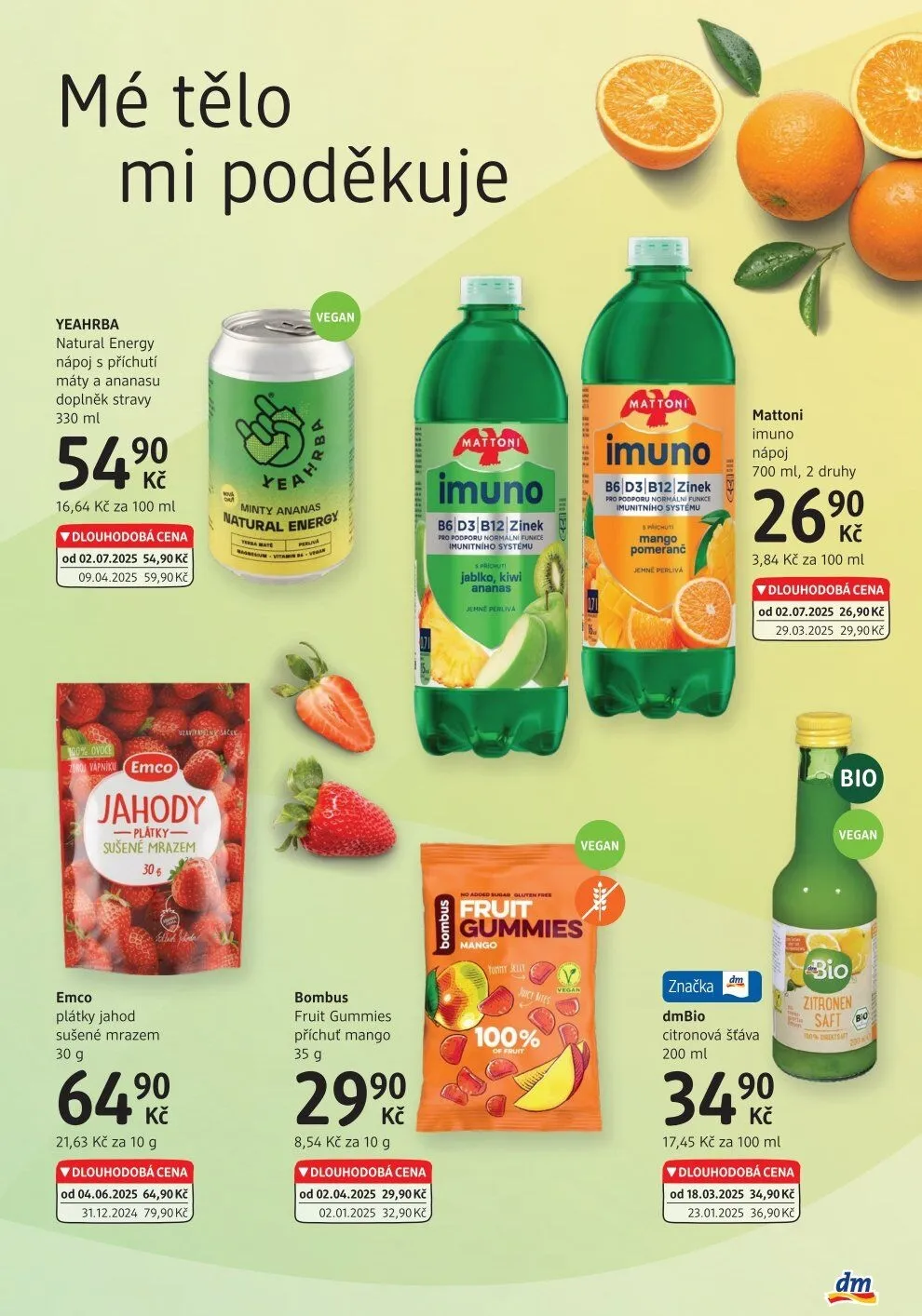 V letáku obchodu dm drogerie najdete širokou nabídku produktů pro zdravý životní styl. Mezi nimi je nápoj "yeahrba" s příchutí máty a ananasu, který je skvělým doplňkem stravy. Tento osvěžující nápoj o objemu 330 ml je k dostání za 54,90 Kč.