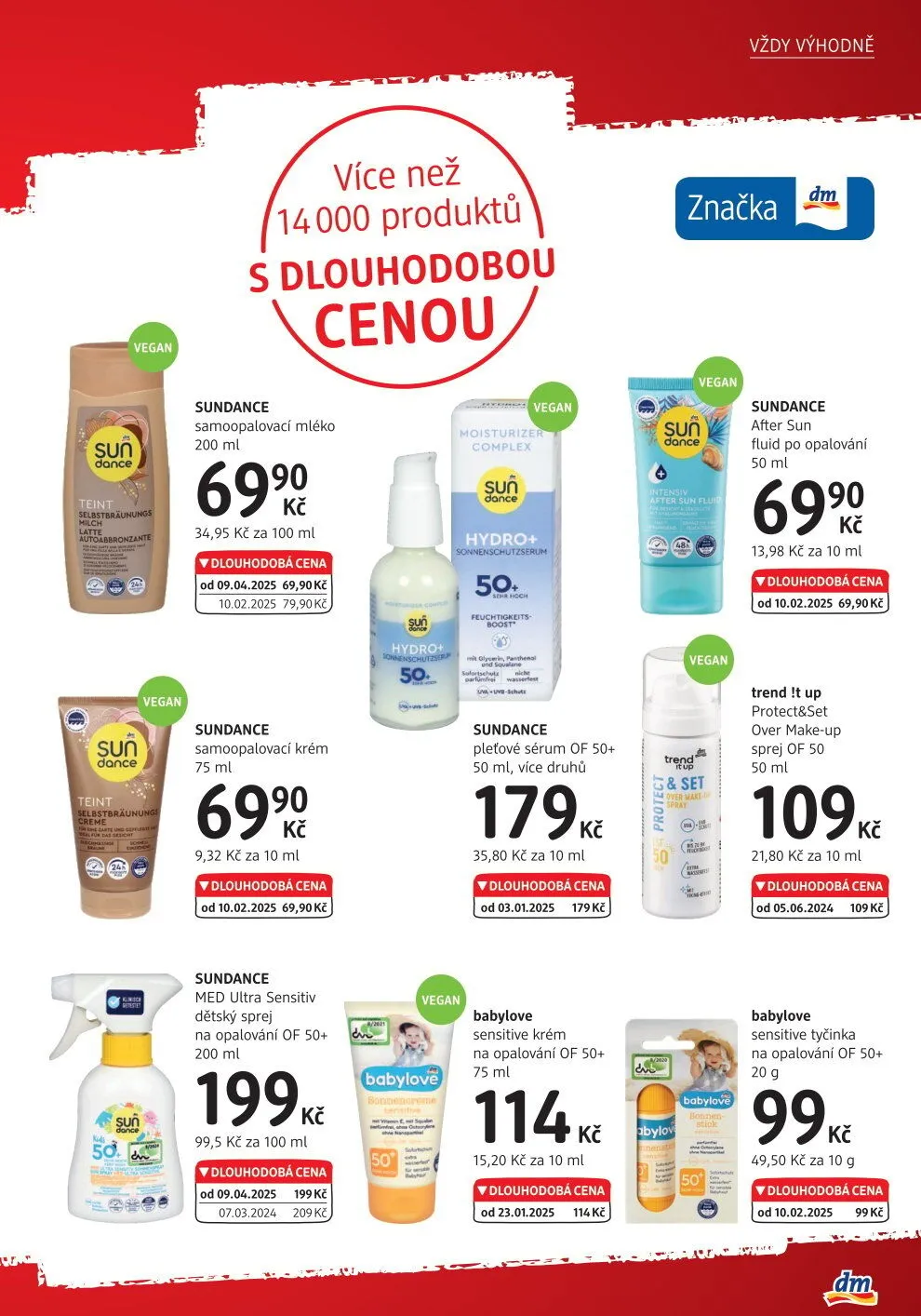 V letáku obchodu dm drogerie najdete širokou nabídku produktů s dlouhodobou cenou. Mezi nimi se nachází například samoopalovací mléko Sundance o objemu 200 ml za 69,90 Kč, nebo samoopalovací krém o objemu 75 ml za 69,90 Kč. Pro děti je k dispozici dětský sprej na opalování s faktorem 50+ od značky Med Ultra Sensitiv za 199 Kč.