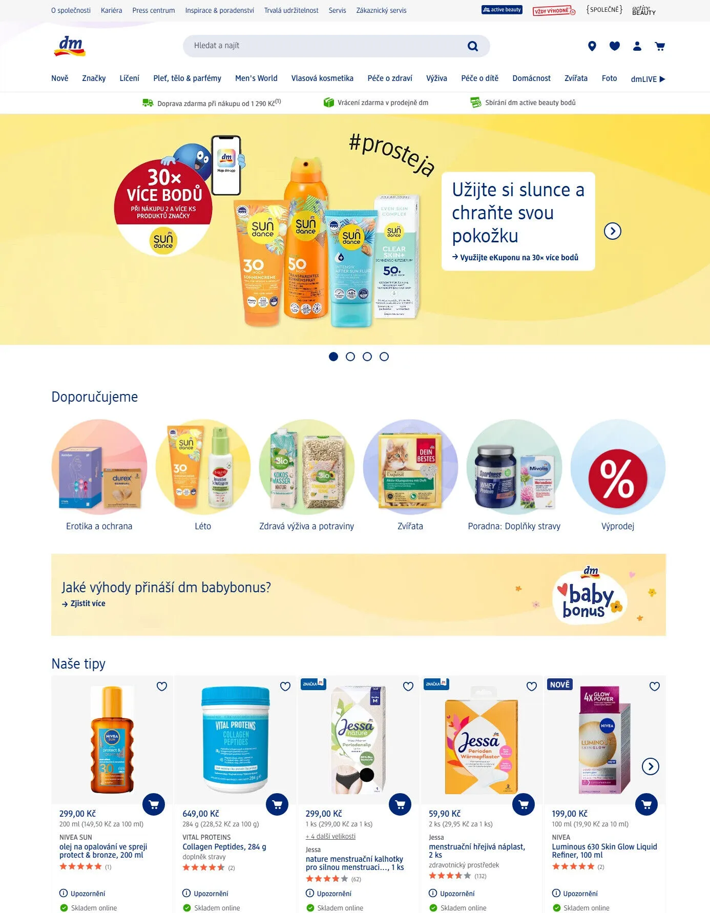 V letáku obchodu dm drogerie najdete širokou nabídku produktů pro každodenní péči a zdraví. Mezi doporučované položky patří olej na opalování Nivea Sun Protect & Bronze, který chrání pokožku a zároveň ji opaluje. Dále si můžete pořídit Vital Proteins Collagen Peptides, doplněk stravy pro podporu zdraví pleti a kloubů. Pro ženy jsou k dispozici menstruační kalhotky Jessa, ideální pro silnou menstruaci, a hřejivá náplast Jessa, která poskytuje úlevu během menstruace. Nezapomeňte také na Nivea Luminous 630 Skin Glow Liquid Refiner, který zpevňuje pleť a dodává jí zdravý vzhled. Využijte akce na sbírání dm active beauty bodů a dopravu zdarma při nákupu nad 1 290 Kč!