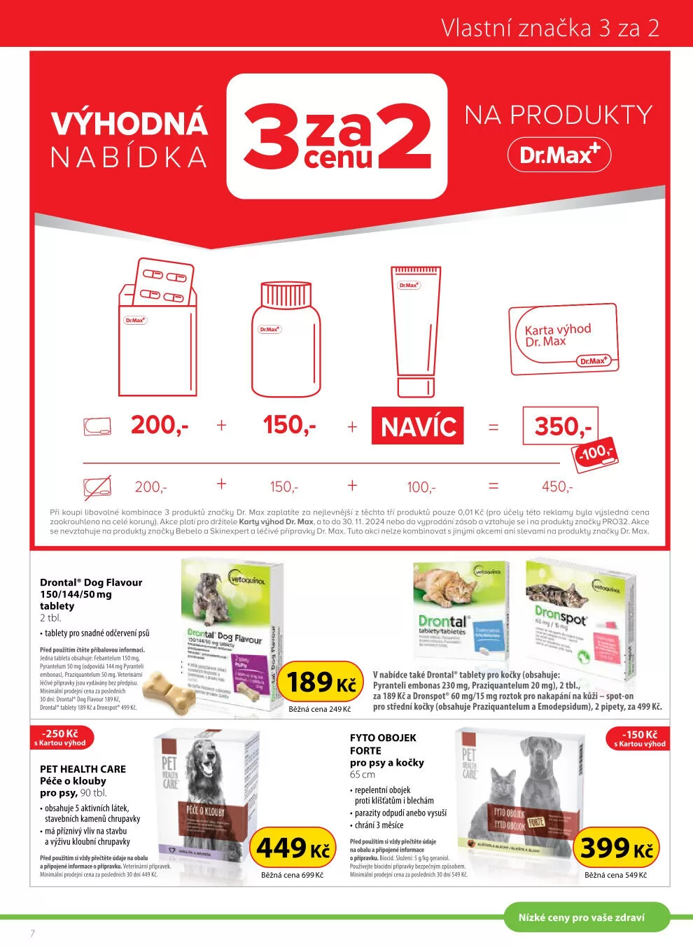 Mezi nabízenými produkty jsou tablety Drontal pro snadné odčervení psů, které jsou nyní za 189 Kč (běžná cena 249 Kč). Dále je k dispozici péče o klouby pro psy, obsahující 5 aktivních látek, za cenu 449 Kč (běžná cena 699 Kč).