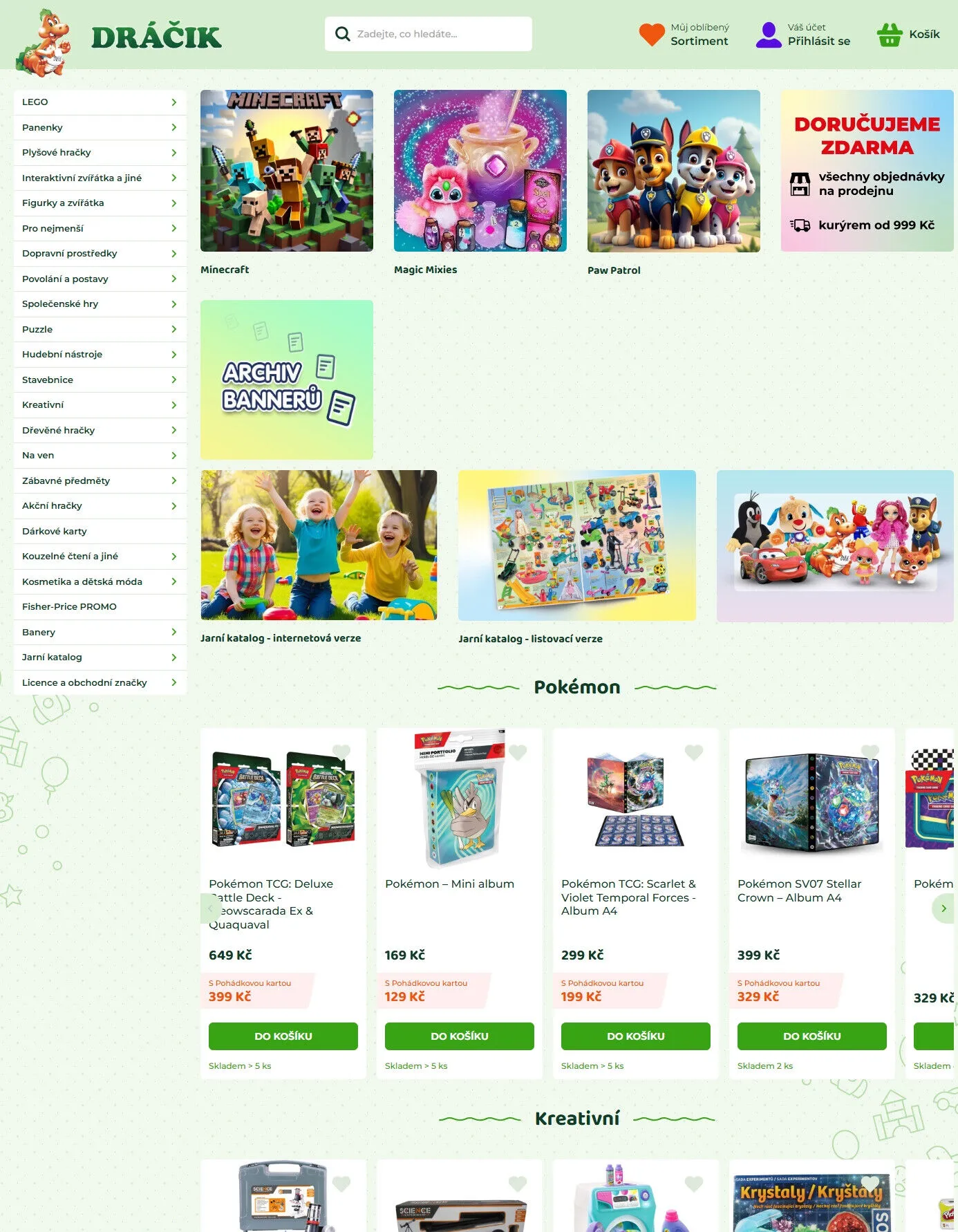 V letáku obchodu Dráčik najdete široký výběr produktů pro děti všech věkových kategorií. Nabízíme populární LEGO stavebnice, panenky, plyšové hračky a interaktivní zvířátka. Pro nejmenší máme připravené dřevěné hračky a dopravní prostředky. Nechybí ani figurky, společenské hry, puzzle a hudební nástroje.