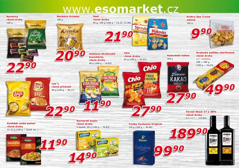 V letáku obchodu ESO MARKET najdete širokou nabídku produktů za skvělé ceny. Mezi nimi se objevují různé druhy kávy, například 100 g balení za 229 Kč. Dále nabízíme bujón a strážnické výrobky, které potěší každého milovníka kvalitních potravin. Nezapomeňte také na naše lahodné kakao za 49 Kč nebo fernet stock za 119 Kč. Pro milovníky sladkostí máme v nabídce i sterilované potraviny, které jsou ideální pro rychlé občerstvení. Navštivte nás a objevte další skvělé nabídky!