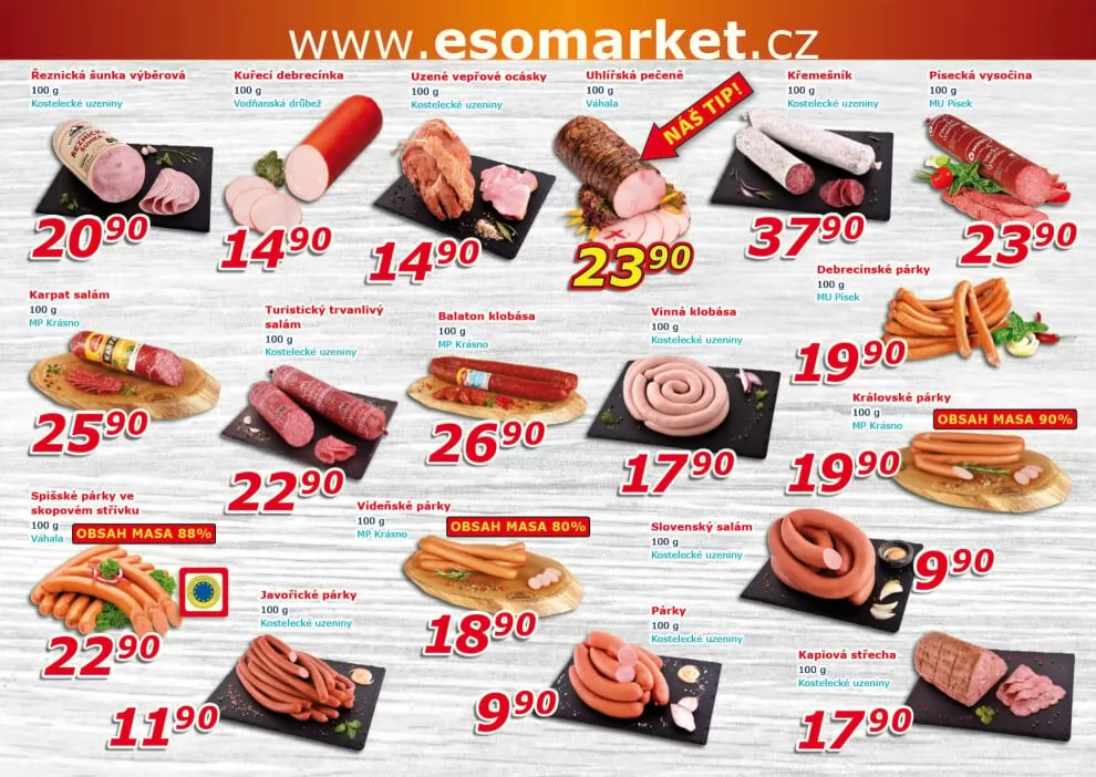 V letáku obchodu ESO MARKET najdete širokou nabídku kvalitních masných výrobků.