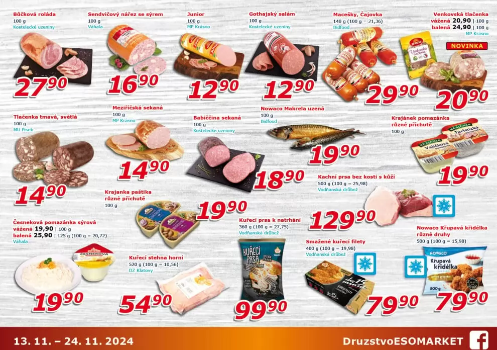 V letáku obchodu ESO MARKET najdete širokou nabídku chutných produktů. Mezi novinkami se objevuje Babiččina sekaná za 20,90 Kč a Po mázánka za 19,90 Kč. Nezapomeňte vyzkoušet Krajanku paátiku v různých příchutích za 14,90 Kč a Nowaco makrelu uzenou za 29,90 Kč. Pro milovníky masa máme také Krajánek azán za 19,90 Kč a Smažené prsa s kůží za 19,90 Kč. Křupavá křidélka Nowaco jsou k dostání za 19,90 Kč. Všechny produkty jsou k dispozici od 13. 11. do 24. 11. 2024. Navštivte nás a objevte skvělé nabídky!