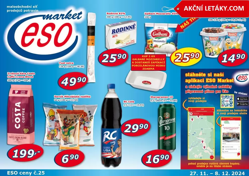 V letáku obchodu ESO MARKET najdete širokou nabídku potravin a dalších produktů za skvělé ceny. Mezi hlavními položkami se objevují lahodné fuet, které si můžete pořídit za 38,38 Kč. Dále nabízíme Galbani mozzarellu za 25,90 Kč, ideální pro přípravu různých pokrmů. Nezapomeňte také na zapékací porcelánovou misku, kterou můžete mít za 149,00 Kč. Pro milovníky nápojů máme RC Colu za 29,90 Kč. Neváhejte a stáhněte si naši aplikaci ESO MARKET, kde si můžete uložit své oblíbené produkty a sledovat aktuální akce. Akce platí od 27. 11. do 8. 12. 2024.