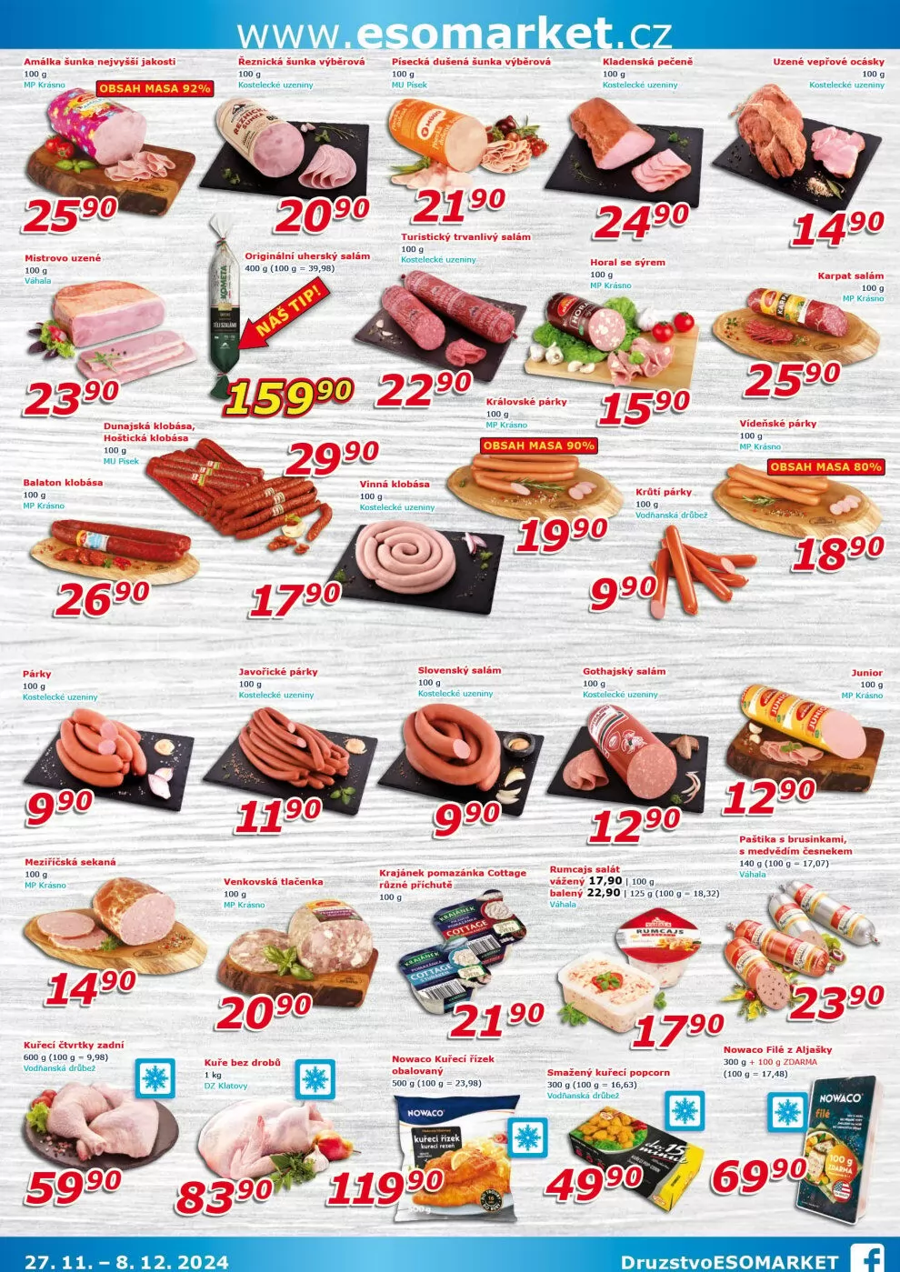 V letáku obchodu ESO MARKET najdete širokou nabídku kvalitních masných výrobků. Mezi nimi se vyjímají: