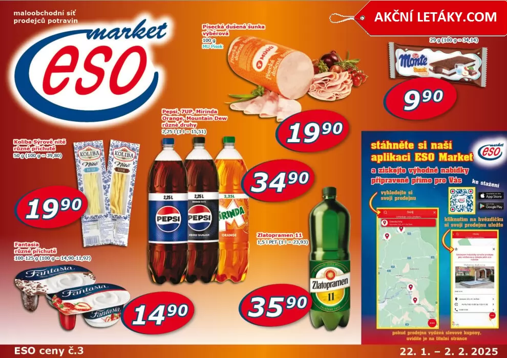 V letáku obchodu ESO MARKET najdete širokou nabídku potravin za skvělé ceny. Mezi hlavními produkty se objevují oblíbené nápoje jako Pepsi a Zlatopramen. Nezapomeňte také využít speciální akce, které platí od 22. 1. do 2. 2. 2025. Pro pohodlnější nakupování si stáhněte naši aplikaci ESO MARKET a mějte všechny nabídky na dosah ruky. Navštivte nás a objevte výhodné ceny a kvalitní produkty!