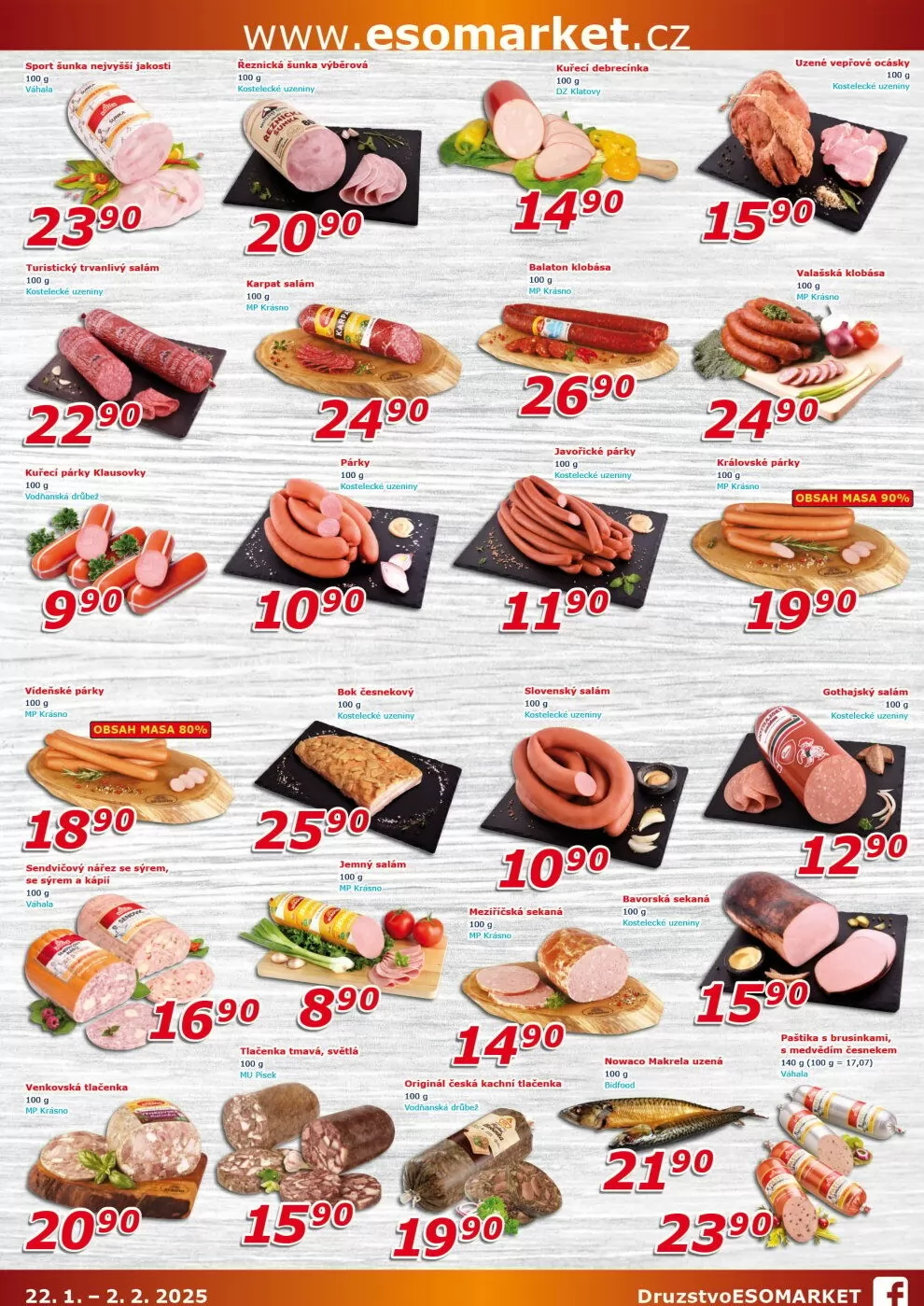 V letáku obchodu ESO MARKET najdete širokou nabídku kvalitních masných výrobků. Mezi nimi se vyjímají řeznické karpatky, které jsou k dostání za 100 g. Dále nabízíme vepřové ocásky a královské párky s vysokým obsahem masa. Nezapomeňte také na gothajské párky a originální kachní výrobky. Všechny produkty jsou pečlivě vybrané a zaručují skvělou chuť. Navštivte nás a objevte chutě, které si zamilujete!