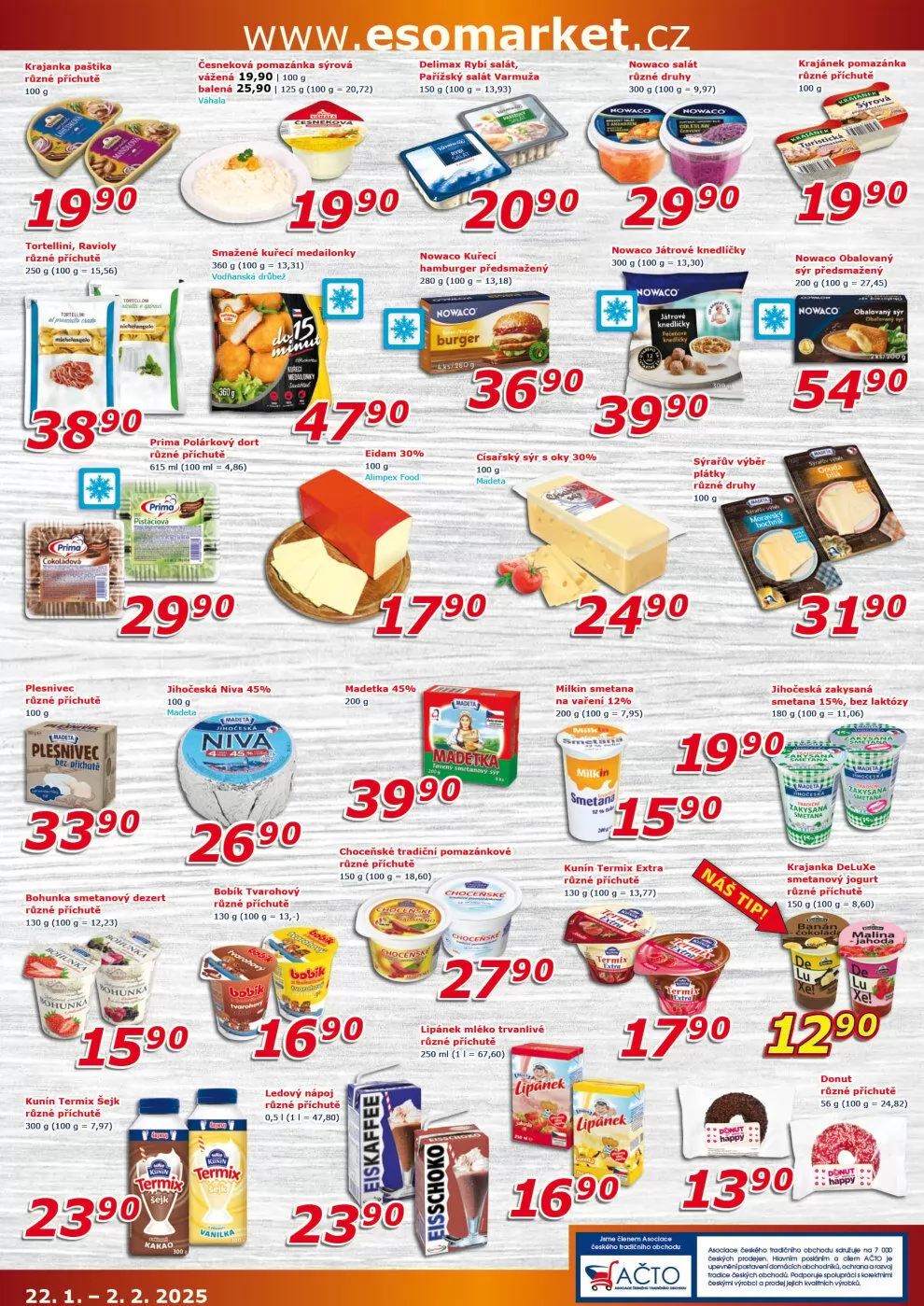V letáku obchodu ESO MARKET najdete širokou nabídku chutných produktů. Mezi nimi jsou například paštiky a smažené medailonky, které potěší každého milovníka dobrého jídla. Nabízíme také různé druhy sýrů, jako je jihočeská niva a eidam, které jsou ideální na chlebíčky nebo do salátů.