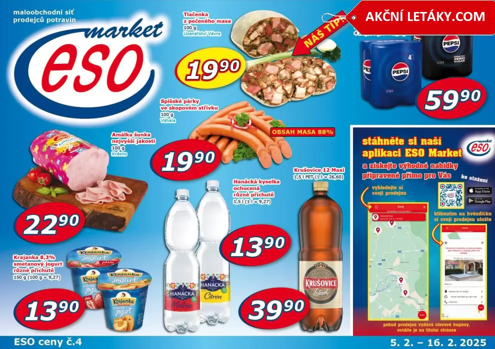 V letáku obchodu ESO MARKET najdete širokou nabídku potravin za skvělé ceny. Mezi produkty se objevují například pečené maso a Spišské párky, které jsou nyní za akční cenu 1990 Kč. Dále si můžete vychutnat skopovou kýtu za 2290 Kč nebo Hanáckou klobásu. Nezapomeňte také na osvěžující nápoje, jako je Pepsi, která je k dostání za 39,90 Kč. Pro milovníky piva máme Krusovice za 59,90 Kč. Stáhněte si naši aplikaci ESO MARKET a uložte si svou oblíbenou prodejnu. Akce platí od 5. 2. do 16. 2. 2025.