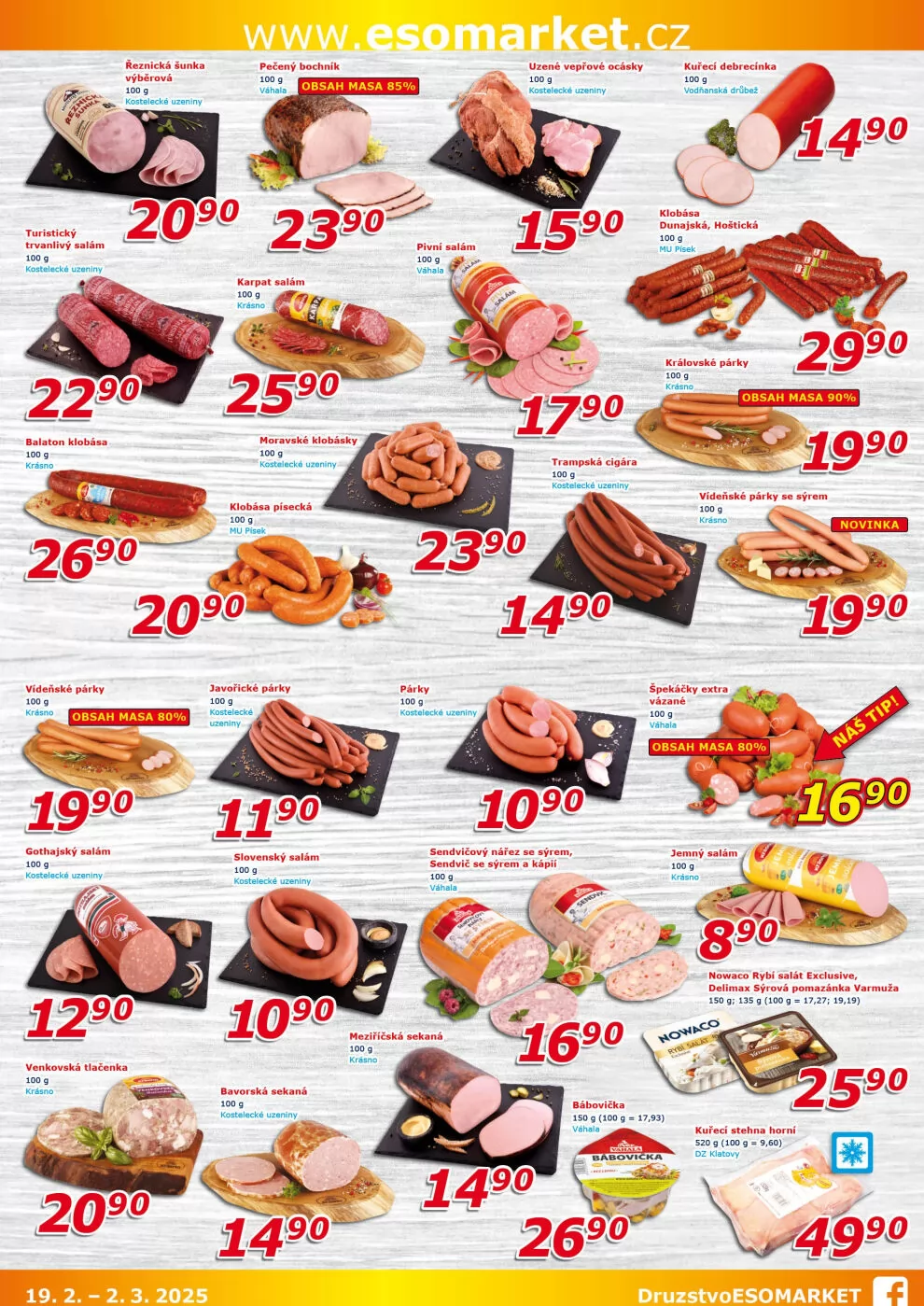 V letáku obchodu ESO MARKET najdete široký výběr kvalitních uzenin a masných výrobků. Mezi nimi se objevují trvanlivé salámy jako je gothajský salám a karpat salám, které jsou ideální pro přípravu různých pokrmů. Dále nabízíme vídeňské párky a debrecínku, které potěší každého milovníka masných delikates.
