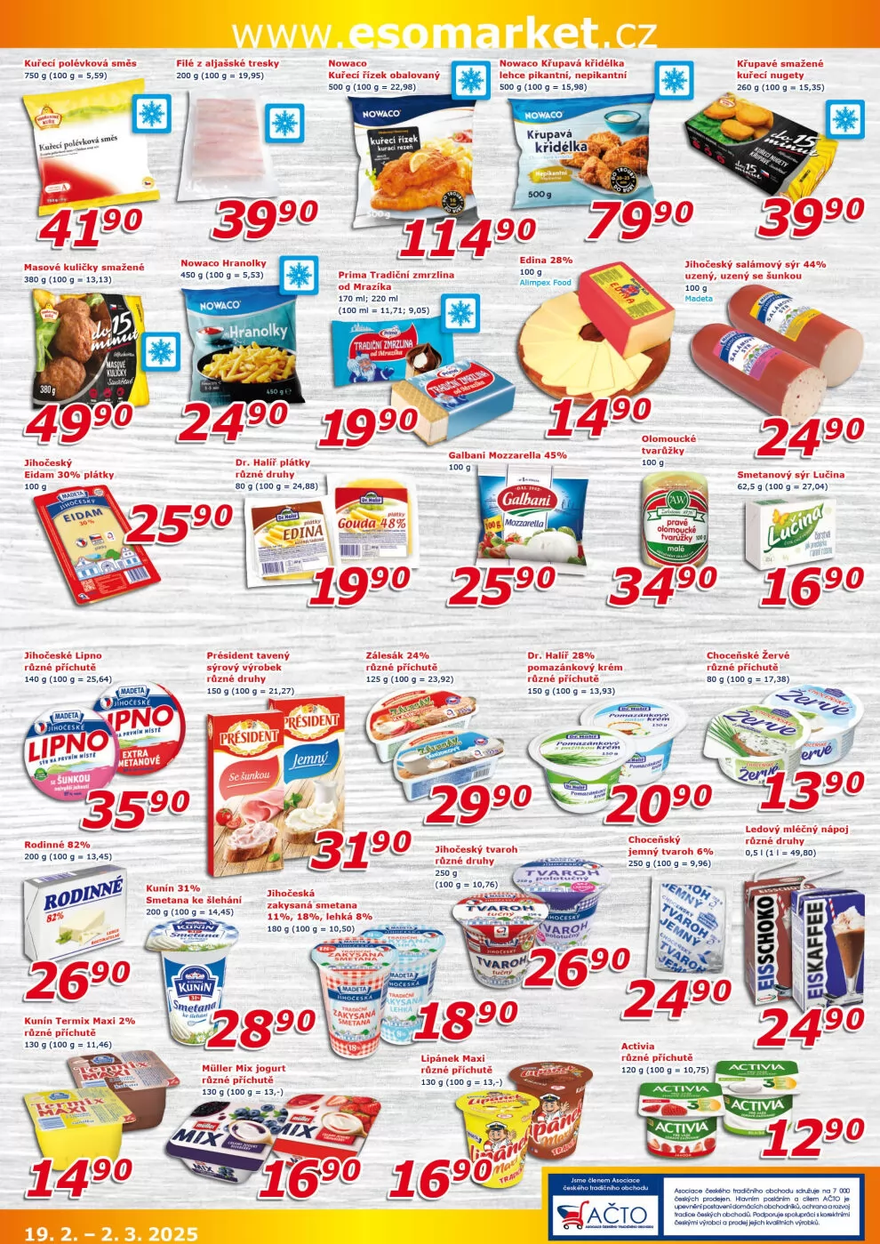 V letáku obchodu ESO MARKET najdete širokou nabídku produktů, které potěší každého zákazníka. Mezi nimi je polévková směs 750 g za 5,59 Kč, kuličky za 13,13 Kč a eidam plátky různých příchutí 140 g za 2,64 Kč. Dále nabízíme filé z aljašské tresky 200 g za 19,95 Kč a obalovaná kuřecí křidélka s různými variantami za 22,98 Kč.