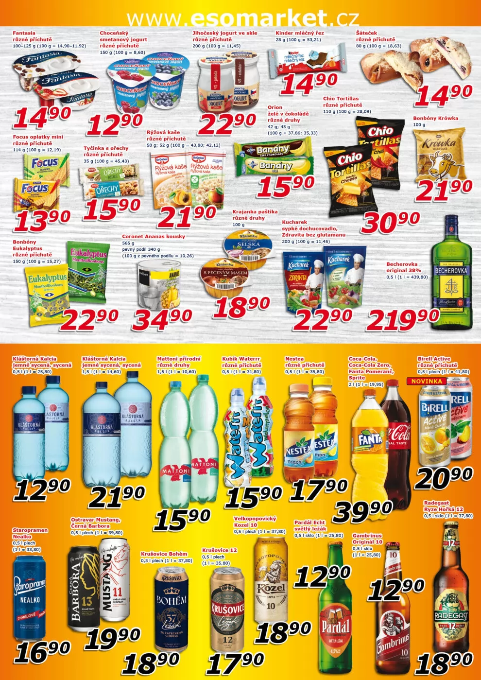 V letáku obchodu ESO MARKET najdete širokou nabídku produktů, které potěší každého zákazníka. Nabízíme různé příchutě oblíbených oplatků a tyčinek s ořechy, které jsou ideální na svačinu. Pro milovníky jogurtů máme smetanový jogurt a jihočeský jogurt ve skle v několika variantách.