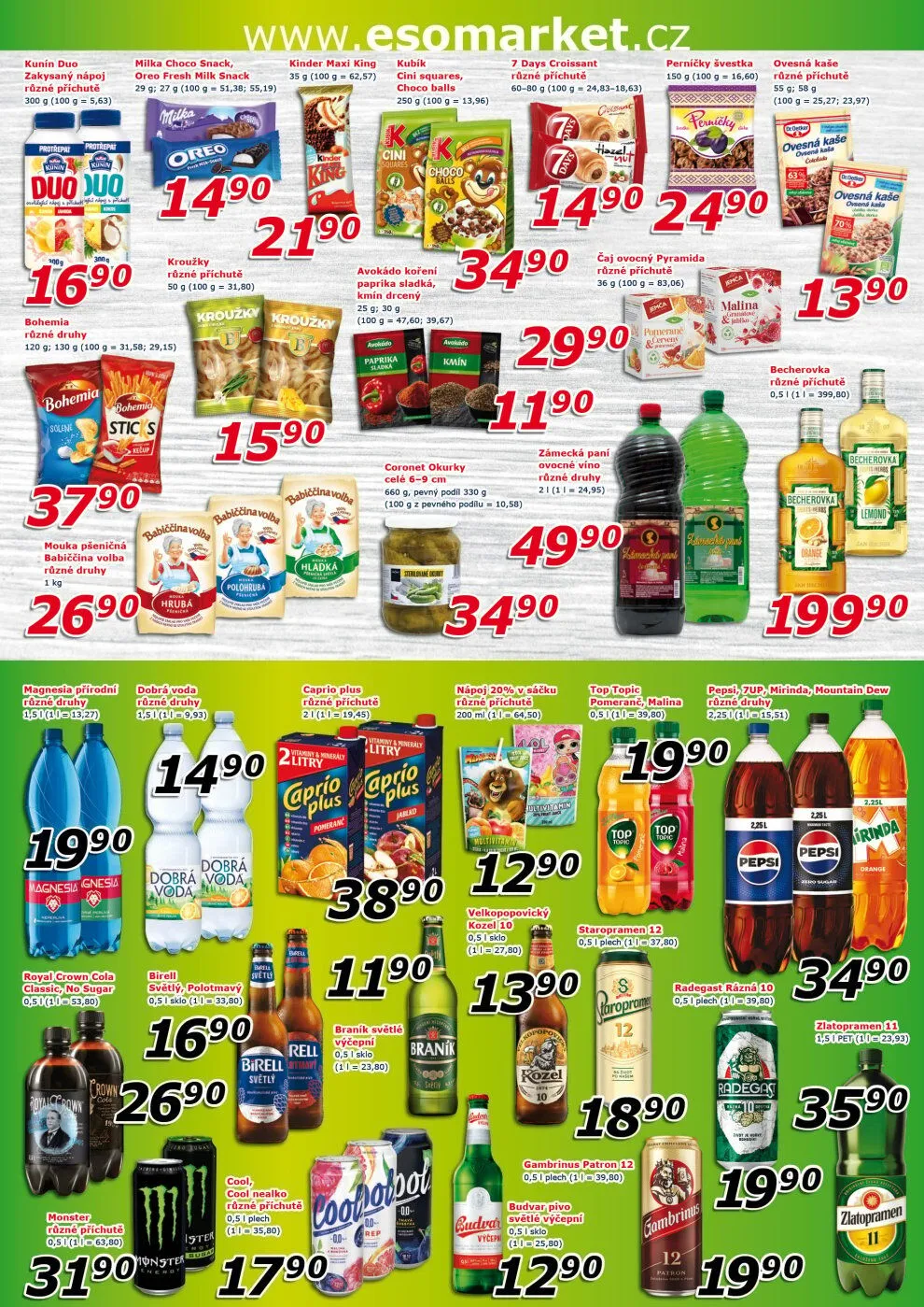 A pro osvěžení si můžete vybrat z různých nealkoholických nápojů, jako jsou Pepsi, 7up nebo Zlatopramen. Navštivte ESO MARKET a objevte všechny tyto skvělé produkty!