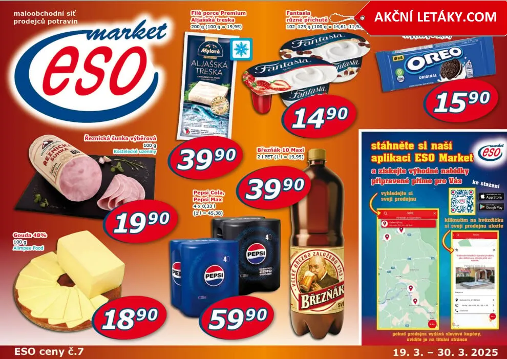 V letáku obchodu ESO MARKET najdete širokou nabídku kvalitních potravin za skvělé ceny. Mezi hlavními produkty se objevuje aljašská treska o hmotnosti 200 g, která je ideální volbou pro milovníky ryb. Dále nabízíme populární nápoj Pepsi Cola v různých variantách, včetně maxi balení. Nezapomeňte také na naše akční ceny, které platí od 19. 3. do 30. 3. 2025. Pro snadnější nakupování si stáhněte naši aplikaci ESO MARKET, kde si můžete vyhledat svou prodejnu a mít všechny nabídky na dosah ruky. Navštivte nás a objevte výhodné nákupy!