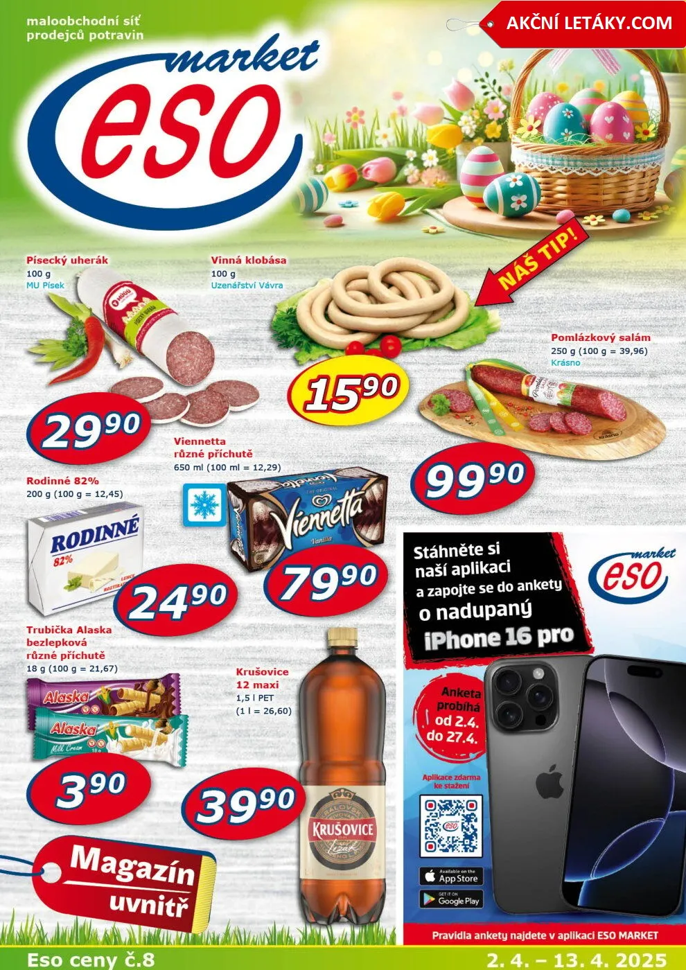 V letáku obchodu ESO MARKET najdete širokou nabídku kvalitních potravin. Mezi nimi se vyjímají produkty jako Písecký uherák (100 g za 29,90 Kč) a Rodinné 82% (200 g za 24,90 Kč). Pro milovníky bezlepkových pochoutek máme Trubičku Alaska v různých příchutích (18 g za 39,00 Kč). Nezapomeňte také na Vinnou klobásu (100 g za 15,90 Kč) a Pomlázkový salám (250 g za 99,90 Kč).