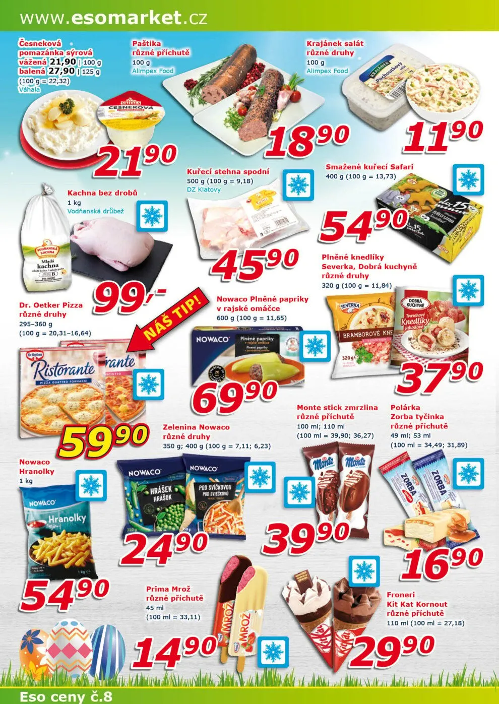 V letáku obchodu ESO MARKET najdete širokou nabídku chutných produktů. Mezi nimi je česneková pomazánka za 21,90 Kč za 100 g a sýrová pomazánka vážená za 27,90 Kč za 125 g. Dále nabízíme paštiku v různých příchutích za 18,90 Kč za 100 g a krajánek salát od Alimpex Food.