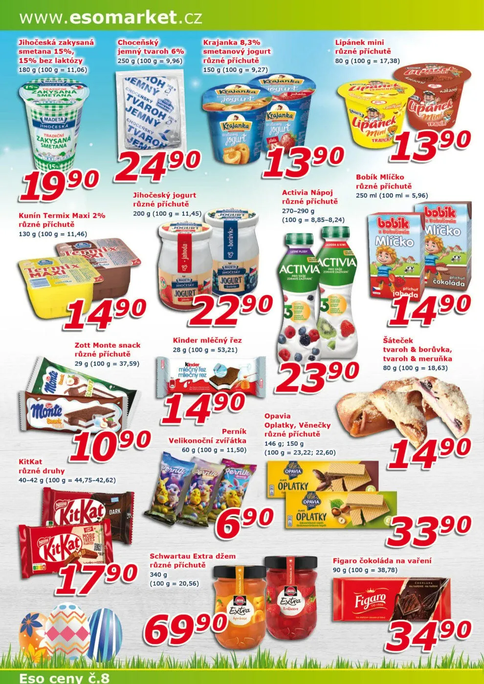 V letáku obchodu ESO MARKET najdete širokou nabídku kvalitních mléčných výrobků a sladkostí. Mezi nimi se nachází jihočeská zakysaná smetana, která je k dispozici i bez laktózy. Dále nabízíme Kunín Termix maxi s různými příchutěmi a Choceňský jemný tvaroh s obsahem tuku 6%.