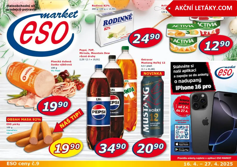 V letáku obchodu ESO MARKET najdete širokou nabídku produktů za skvělé ceny. Mezi novinkami se objevují ESO párky s obsahem masa za 19,90 Kč a rodinné balení vibrační šunky za 12,45 Kč. Nezapomeňte také na oblíbené nápoje jako Pepsi, Mirinda a Mountain Dew v 2,25 l balení za 34,90 Kč. Pro milovníky jogurtů je tu Activia v různých příchutích za 12,90 Kč (100 g = 10,7 Kč). A nezapomeňte si stáhnout naši aplikaci, kde můžete soutěžit o nadupaný iPhone 16 Pro do 27. 4. 2025!