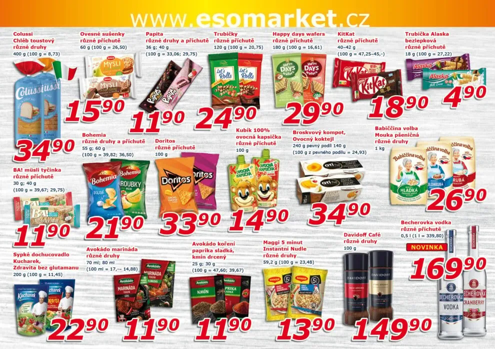 V letáku obchodu ESO MARKET najdete širokou nabídku produktů pro každého. Mezi nimi se nachází toustový chléb značky Colussi v různých druzích, ovesné sušenky s různými příchutěmi a bezlepkové tyčinky. Dále nabízíme ovocné kapsičky, broskvový kompot a Babiččinu volbu v různých variantách. Nezapomeňte také na zdravé mlsání s müsli tyčinkami a instantními nudlemi Maggi. Pro milovníky delikates máme avokádové marinády a koření. A pro osvěžení si můžete vybrat z různých příchutí vodky. Navštivte nás a objevte všechny chutě!