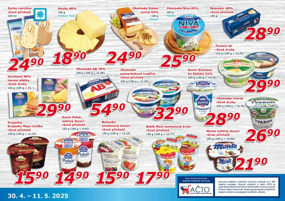 V letáku obchodu ESO MARKET najdete širokou nabídku lahodných produktů. Mezi nimi se objevují zmrzliny Zorba v různých příchutích, které osvěží v horkých dnech. Dále nabízíme kvalitní sýry jako Goudu, Jihočeský eidam a Nivu, ideální pro přípravu různých pokrmů.
