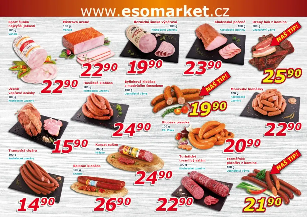 V letáku obchodu ESO MARKET najdete širokou nabídku kvalitních masných výrobků. Mezi nimi se objevují lahodné sport šunky, vepřové ocásky a trampská cigára. Nechybí ani speciality jako klobása pisecká a karpat salám. Pro milovníky uzenin jsou připraveny balaton klobása a párečky z komína Vávra. Všechny produkty jsou pečlivě vybrány a nabízeny za skvělé ceny. Navštivte ESO MARKET a objevte chutě, které si zamilujete!