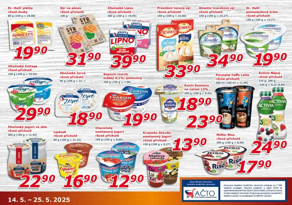 V letáku obchodu ESO MARKET najdete širokou nabídku kvalitních mléčných výrobků. Mezi nimi se objevují plátky dr. Halíře v různých druzích za cenu 199 Kč. Dále nabízíme cottage s různými příchutěmi za 299 Kč a jihočeský jogurt ve skle, který si můžete pořídit za 200 Kč.