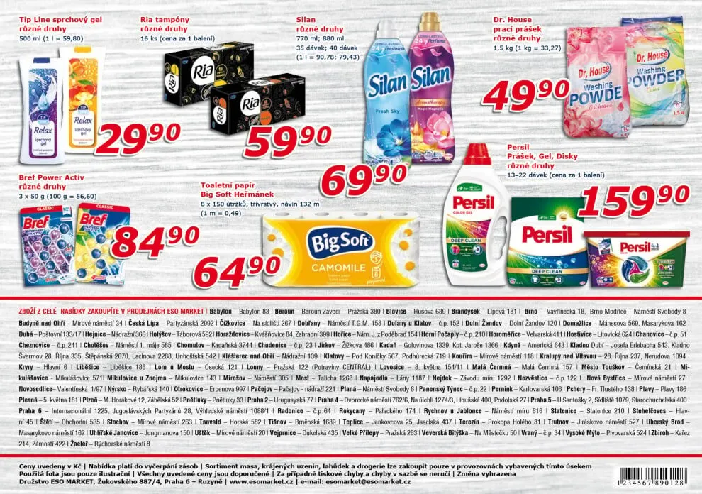 V letáku obchodu ESO MARKET najdete širokou nabídku produktů za skvělé ceny. Mezi nimi jsou různé druhy tip gelů za 59,40 Kč, pánské výrobky Ria za 26 Kč (balení 26 ks), a Silan v různých variantách o objemu 770 ml a 900 ml za 35 Kč. Dále nabízíme Bref Power Activ v různých druzích a prací prášky Ersil, které jsou k dispozici v balení 3 kg za 159,90 Kč. Nezapomeňte také na Big Soft Heřmánek za 0,49 Kč. Celou nabídku si můžete zakoupit v našich prodejnách ESO MARKET. Těšíme se na vaši návštěvu!