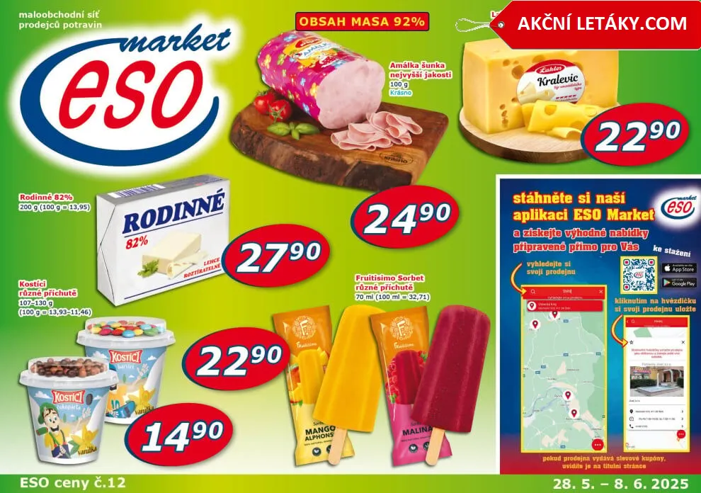 V letáku obchodu ESO MARKET najdete širokou nabídku kvalitních potravin za skvělé ceny. Mezi oblíbené produkty patří šunka Amálka s obsahem masa 92% za 2490 Kč, nebo královský sýr ementálského typu 45% za 2290 Kč za 100 g. Nezapomeňte si stáhnout naši aplikaci ESO MARKET, kde si můžete uložit svou oblíbenou prodejnu a mít přehled o aktuálních akcích. Navštivte nás a objevte rodinné hodnoty, které nabízíme s důrazem na kvalitu a čerstvost!