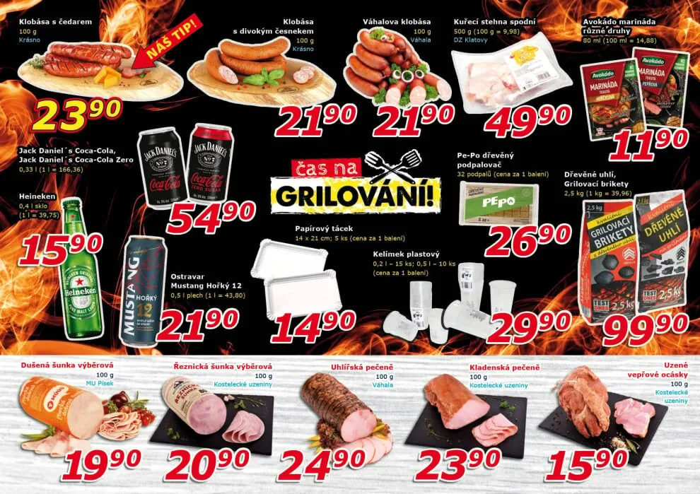 V letáku obchodu ESO MARKET najdete širokou nabídku kvalitních produktů. Mezi nimi se vyjímají klobásy s čedarem, které jsou skvělou volbou pro grilování. Dále nabízíme výběrovou šunku a vepřové ocásky, které potěší každého milovníka masa. Pro osvěžení doporučujeme Jack Daniel's s Coca-Colou nebo Coca-Colou Zero. Nezapomeňte také na praktické grilovací potřeby, jako jsou papírové tácy a plastové kelímky. A pro ty, kteří chtějí usnadnit grilování, máme v nabídce podpalovače a grilovací brikety. Navštivte nás a objevte skvělé nabídky!