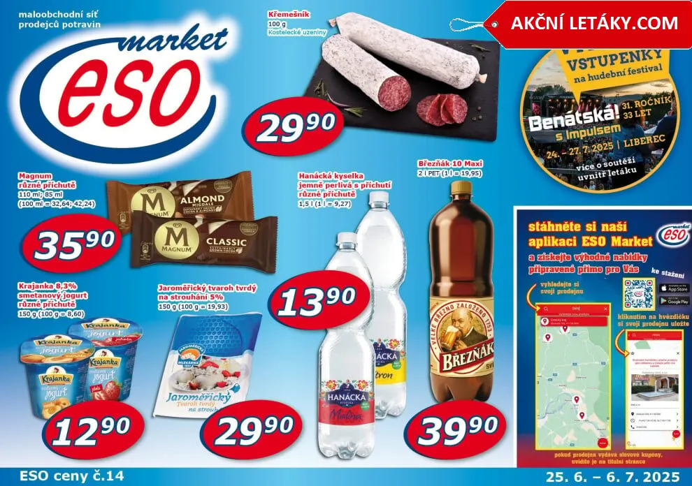 V letáku obchodu ESO MARKET najdete širokou nabídku potravin za skvělé ceny. Mezi produkty se objevují oblíbené položky jako Krajanka za 359 Kč, Hanácká kyselka za 29 Kč a další lahůdky. Nezapomeňte také na speciální akci, kde můžete vyhrát vstupenky na hudební festival. Stáhněte si naši aplikaci ESO MARKET a buďte v obraze o všech novinkách a slevách. Akce platí od 25. 6. do 6. 7. 2025. Navštivte nás a objevte skvělé nabídky!