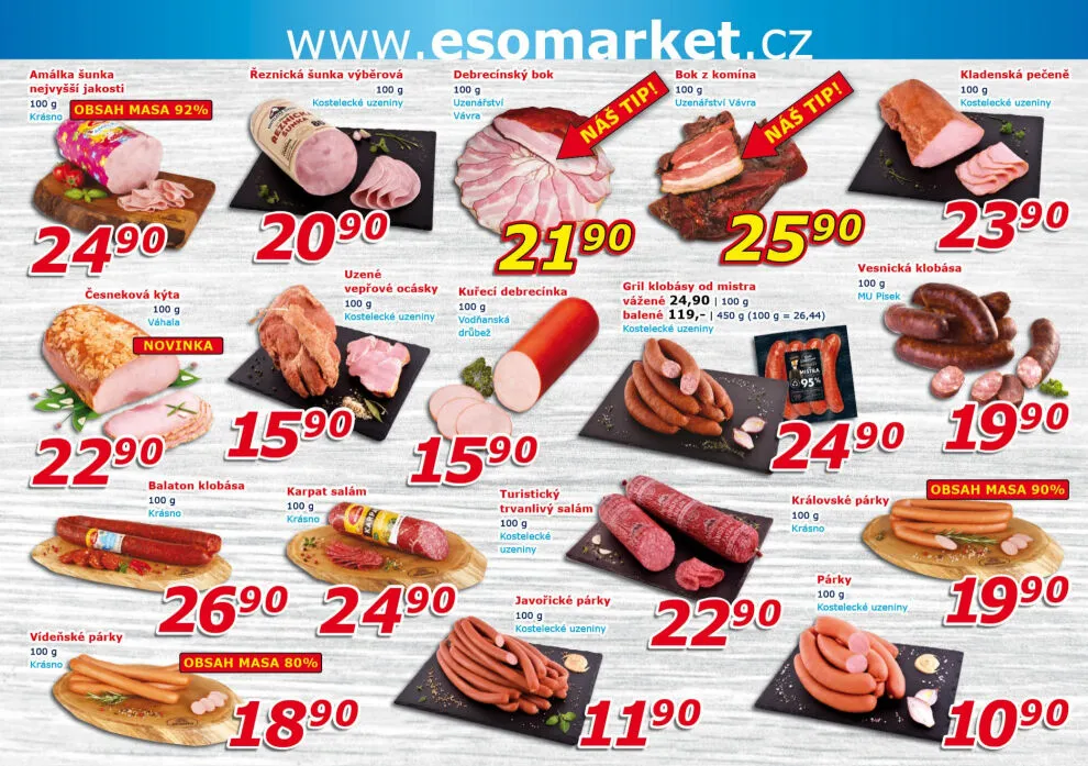 V letáku obchodu ESO MARKET najdete širokou nabídku kvalitních masných výrobků. Mezi nimi se nachází amálka šunka s obsahem masa 92 % za cenu 24,90 Kč za 100 g. Novinkou je česneková kýta, která jistě potěší milovníky výrazných chutí. Dále nabízíme výběrovou řeznickou šunku a vepřový bůček, oba za 100 g za 24,90 Kč.