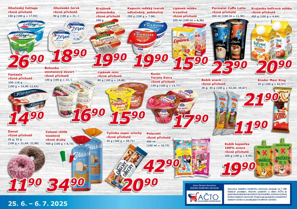 V letáku obchodu ESO MARKET najdete širokou nabídku lahodných mléčných výrobků a snacků. Mezi nimi je jihočeský cottage s různými příchutěmi, žervé a měkký tvaroh v odtučněné a polotučné variantě. Nechybí ani trvanlivé mléko Lipánek a kefírové mléko Krajanka, obojí v několika příchutích.