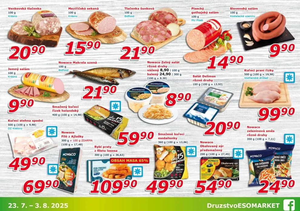V letáku obchodu ESO MARKET najdete širokou nabídku kvalitních produktů. Mezi nimi se nachází venkovská tlačenka za 20,90 Kč za 100 g a jemná sekaná za 15,90 Kč. Pro milovníky ryb je k dispozici makrela Nowaco za 14,98 Kč na 100 g a filé z ajlaiky. Nezapomeňte také na zelnou tlačenku a různé druhy salámů, které jsou v akci. Smažené kuře a obalovaný sýr předsmažený jsou skvělou volbou na rychlý oběd. Všechny produkty jsou pečlivě vybrány a nabízejí skvělou chuť za výhodné ceny. Navštivte ESO MARKET a objevte další lahůdky!